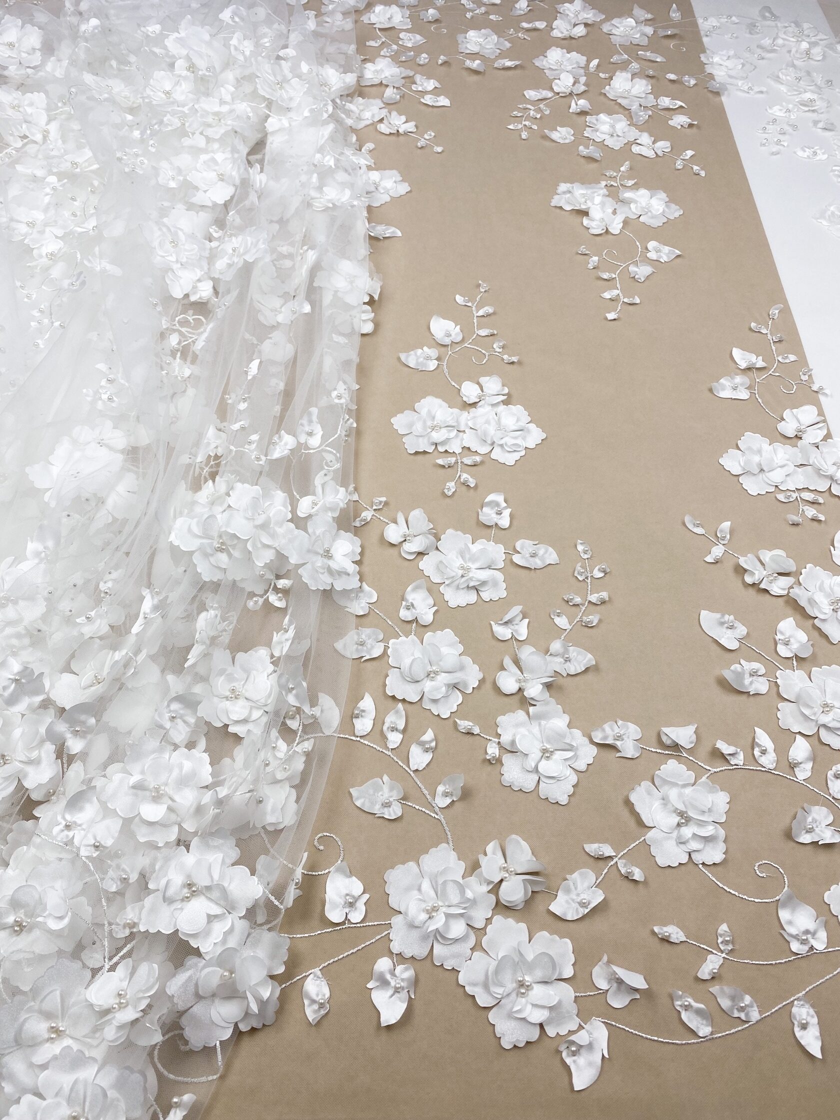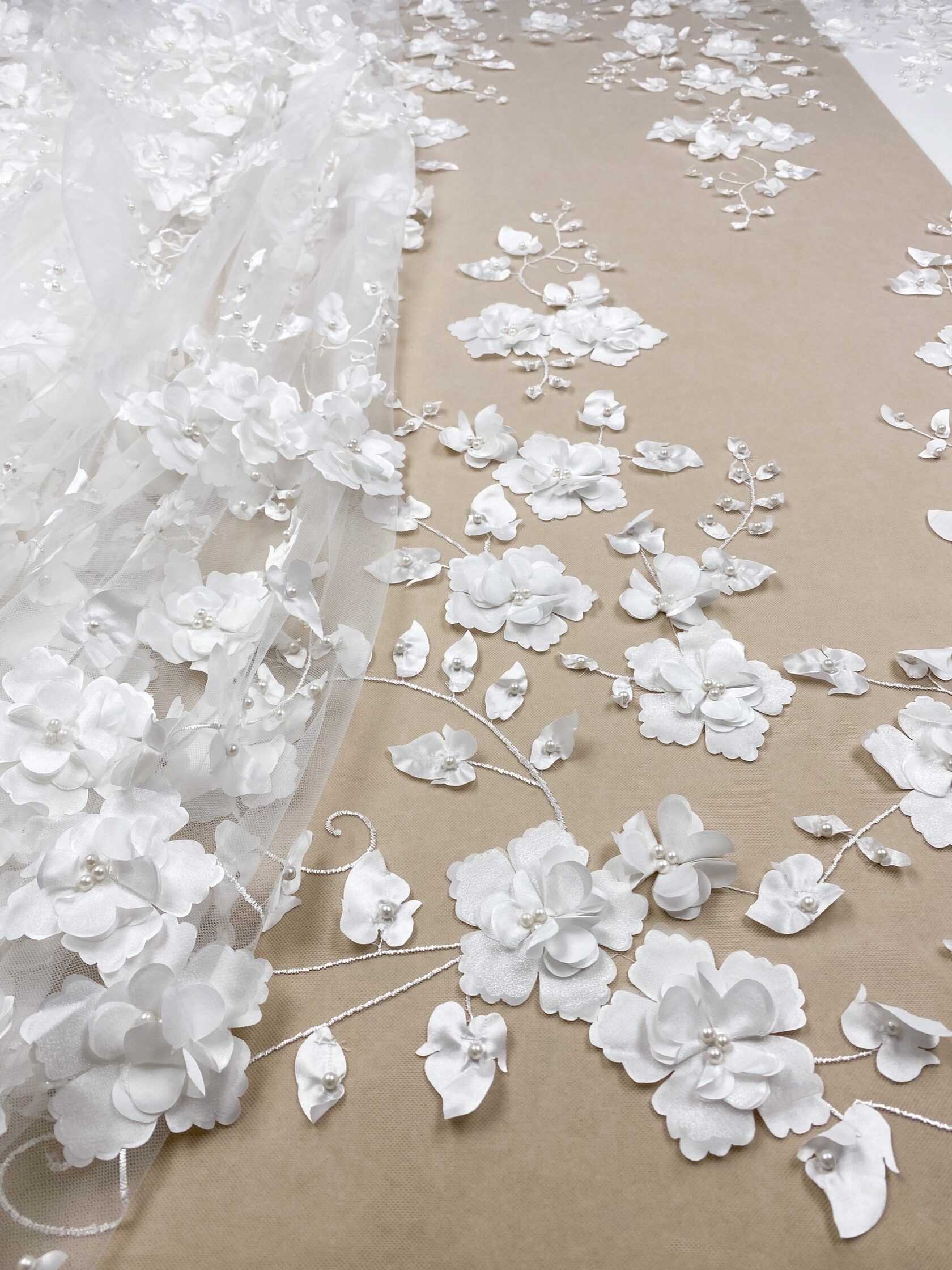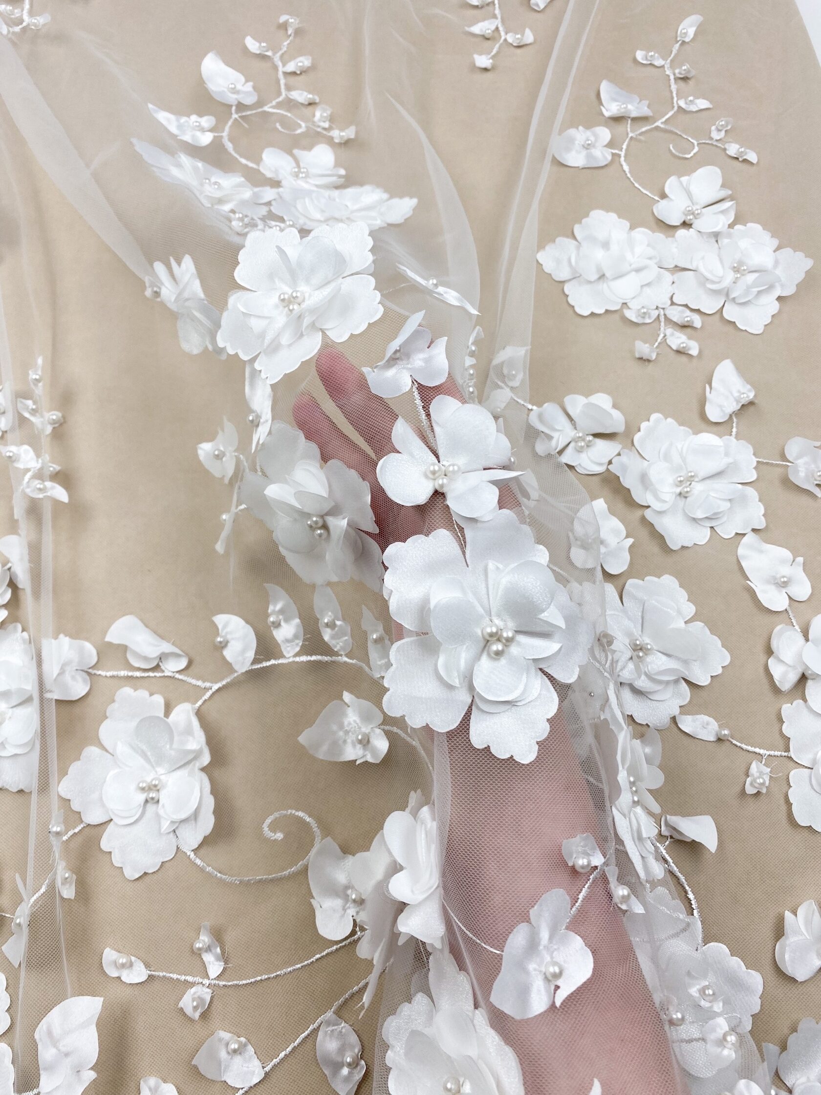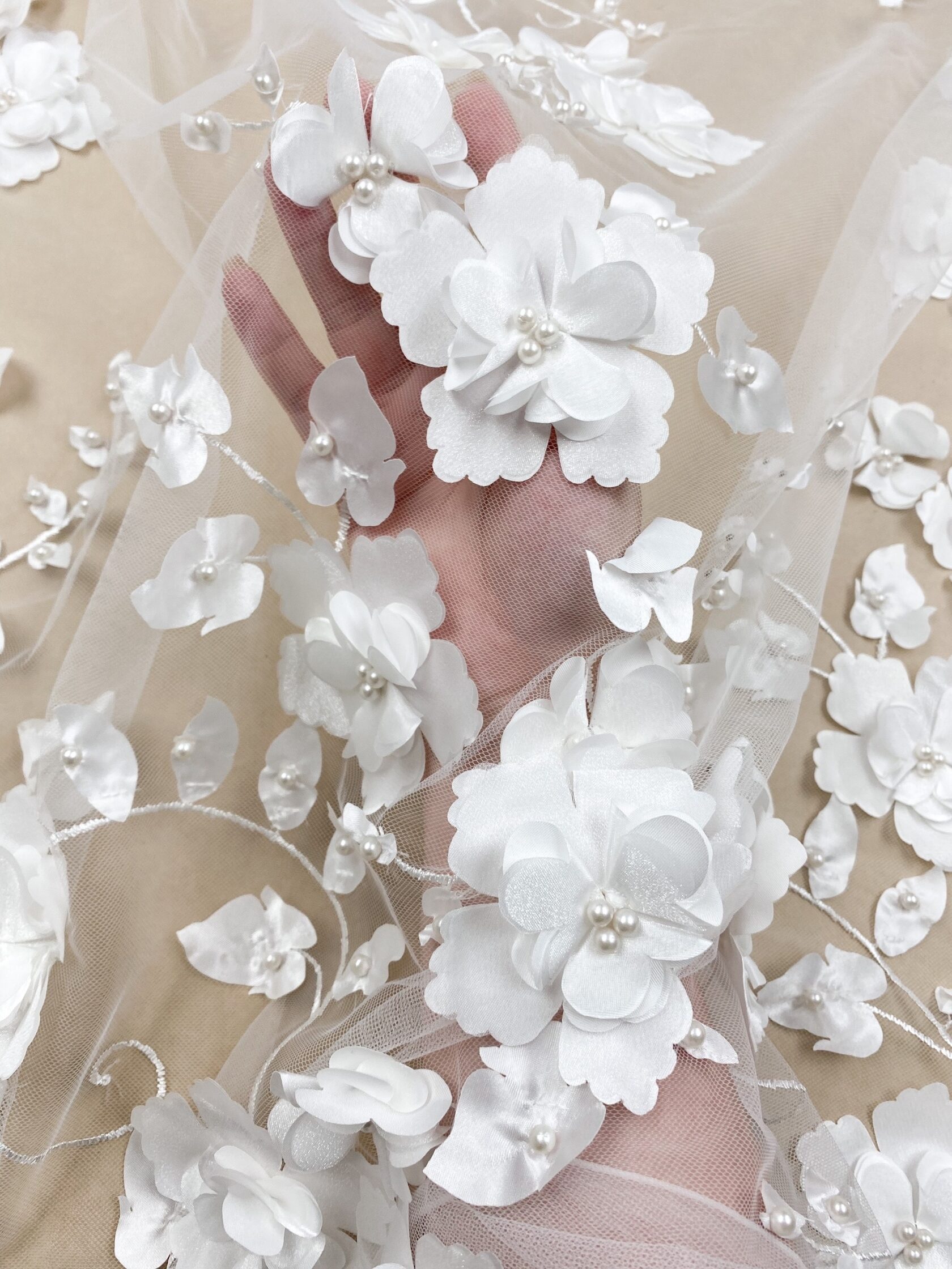 Вышивка, украшенная 3D цветами и 2D лепестками, расшитая жемчужными бусинами Цвет: молочный Режем от 1 раппорта - 0.34м Ширина - 1.43м (с сеткой 1.55м)