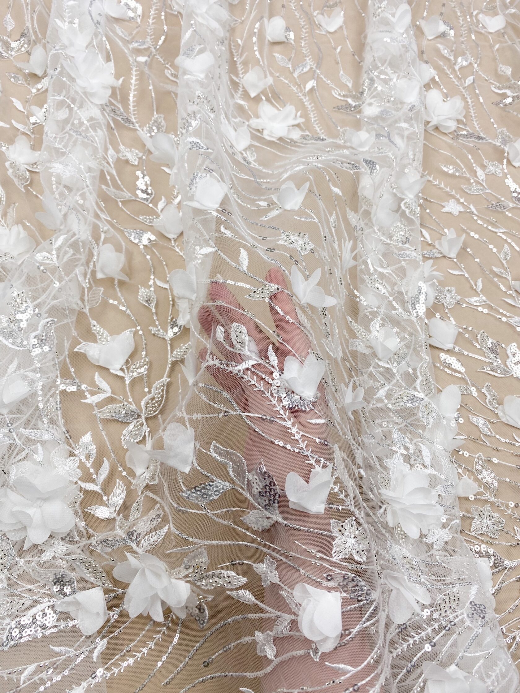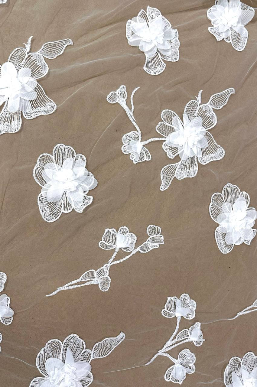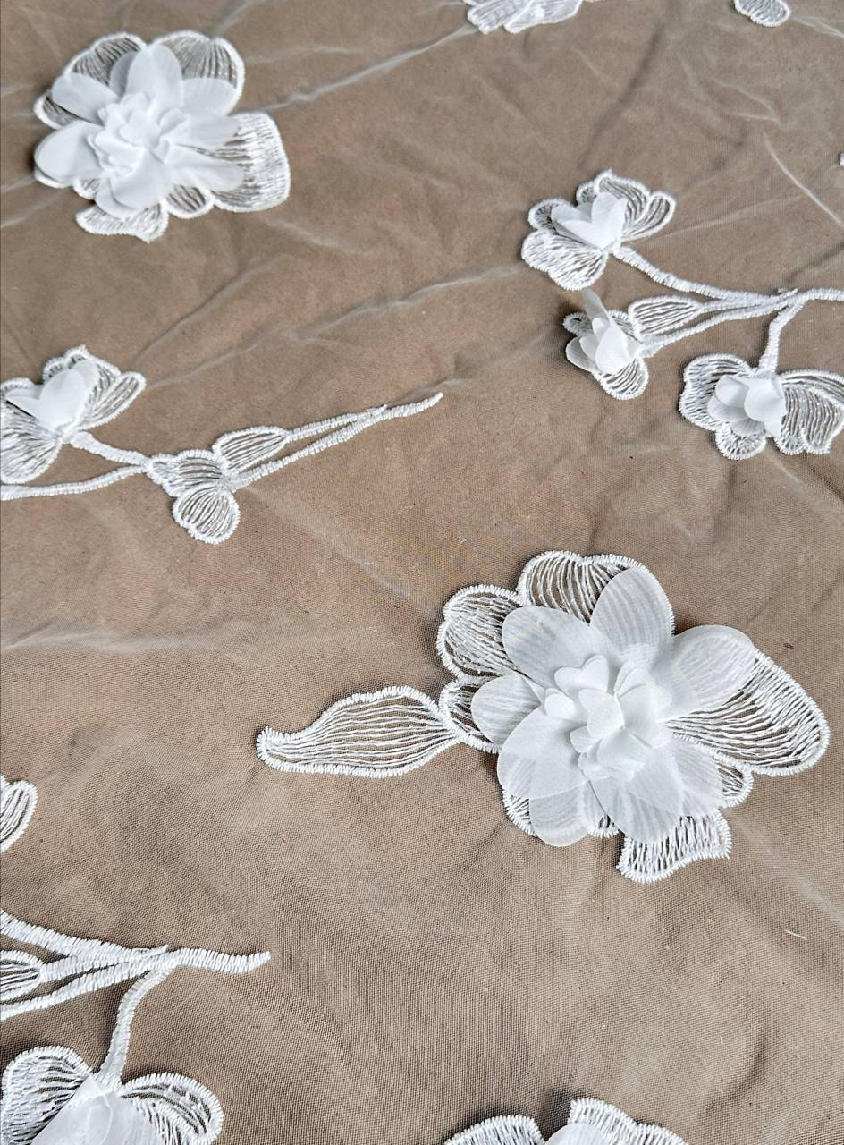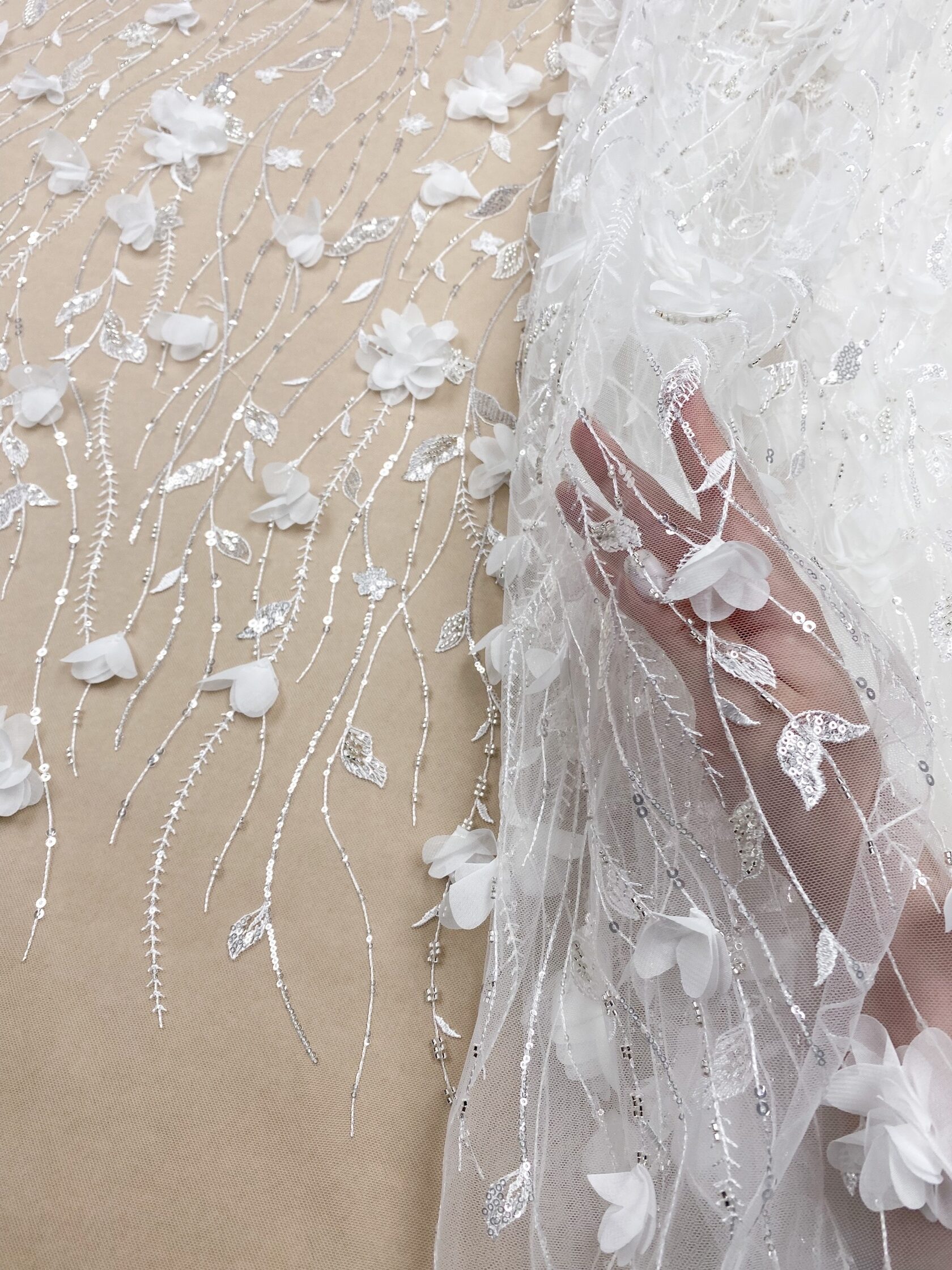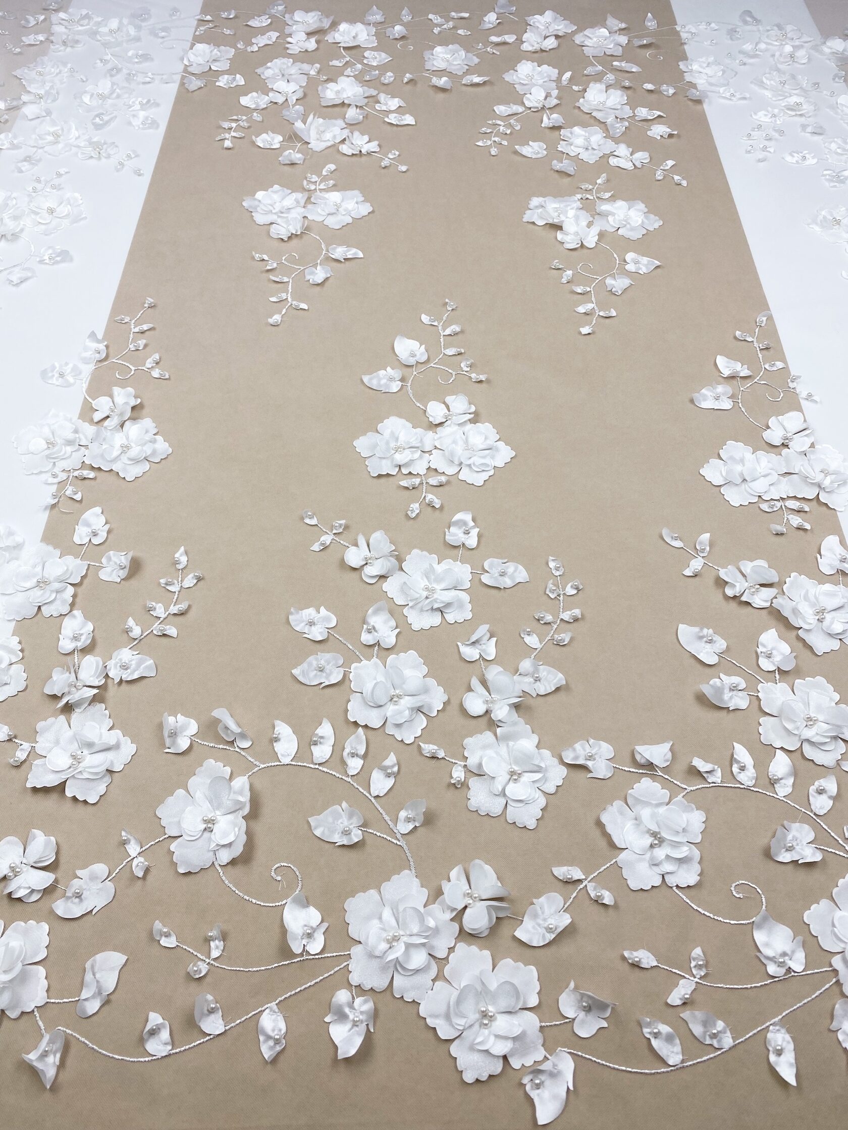Вышивка, украшенная 3D цветами и 2D лепестками, расшитая жемчужными бусинами Цвет: молочный Режем от 1 раппорта - 0.34м Ширина - 1.43м (с сеткой 1.55м)
