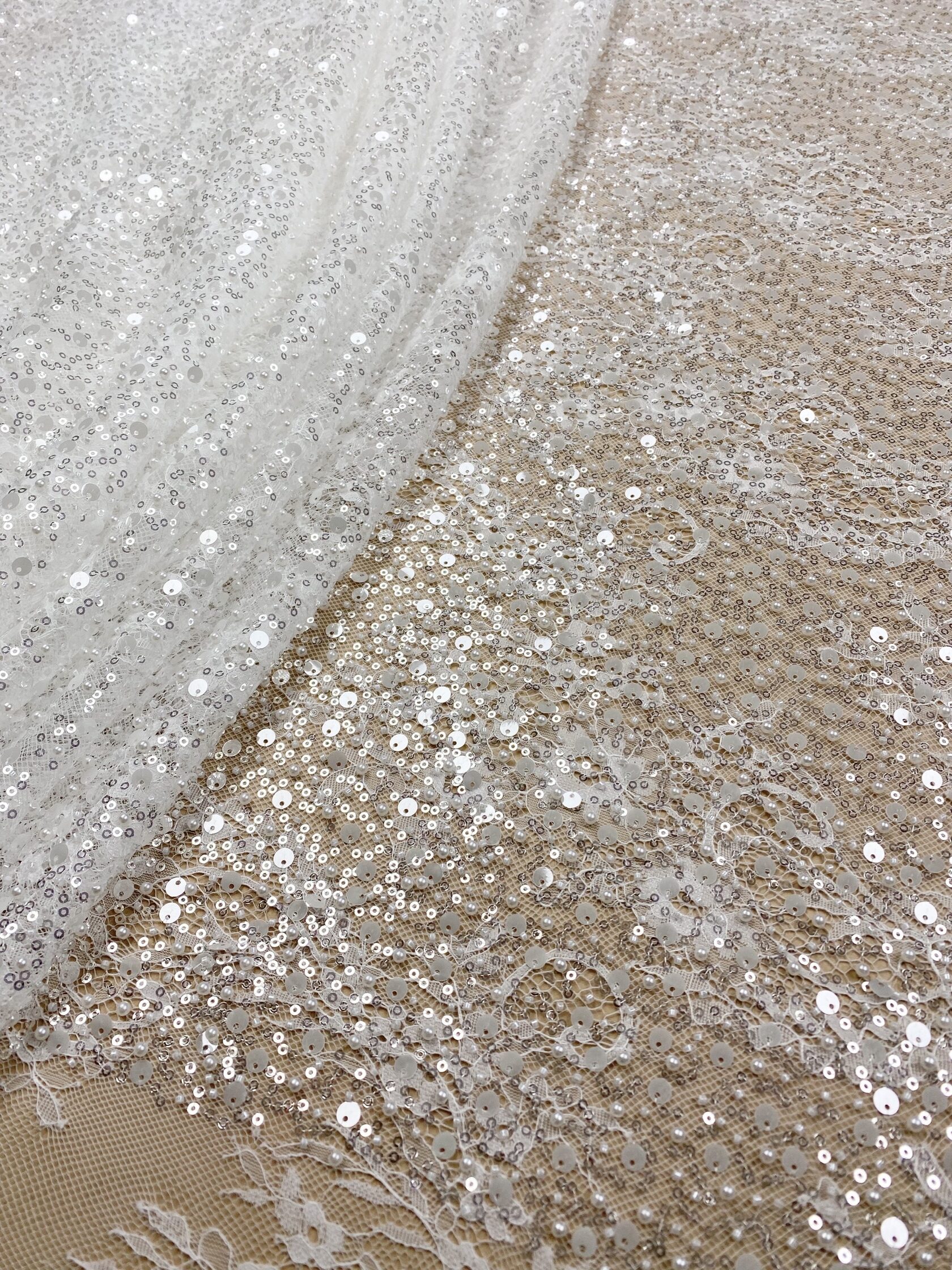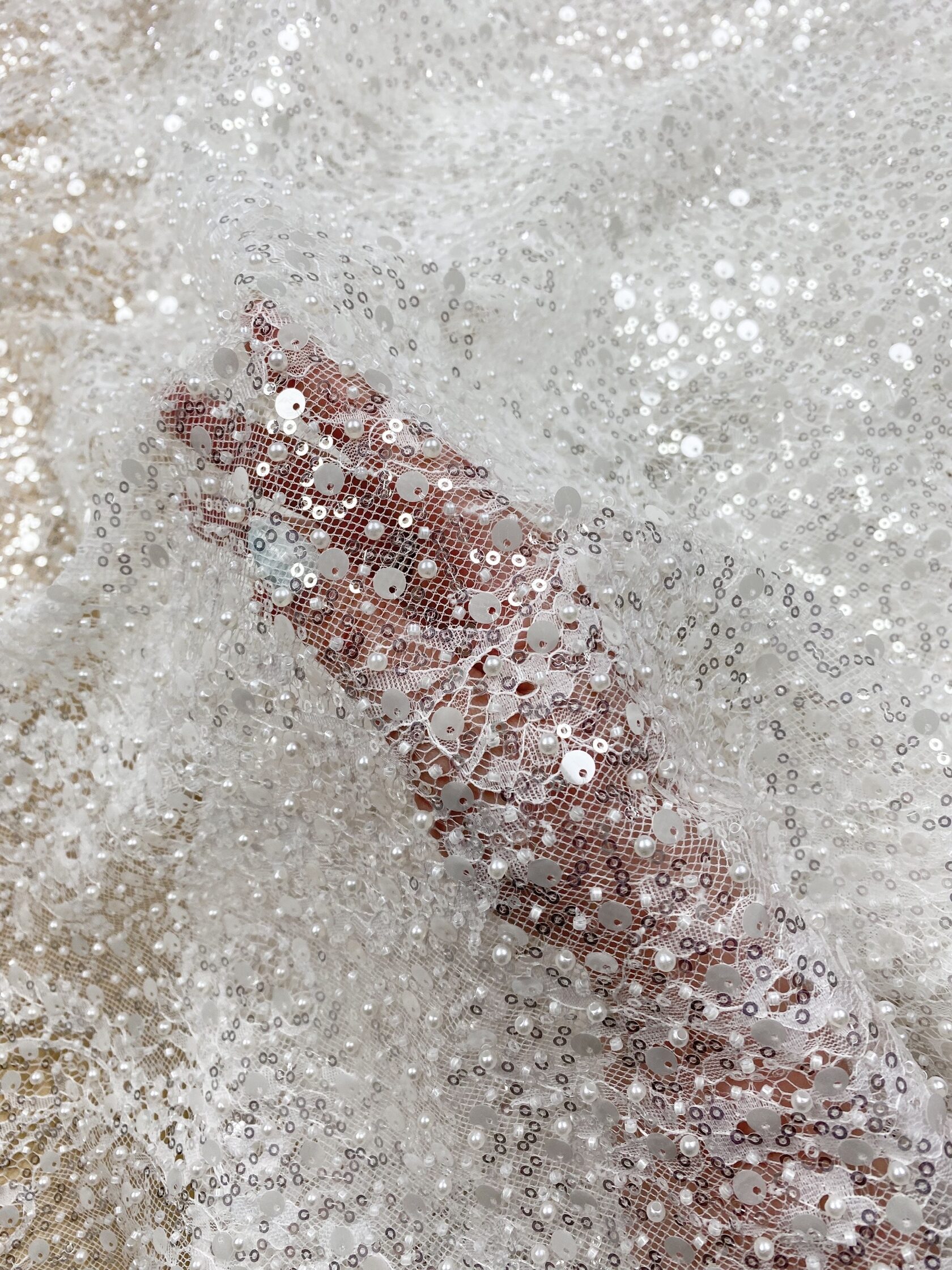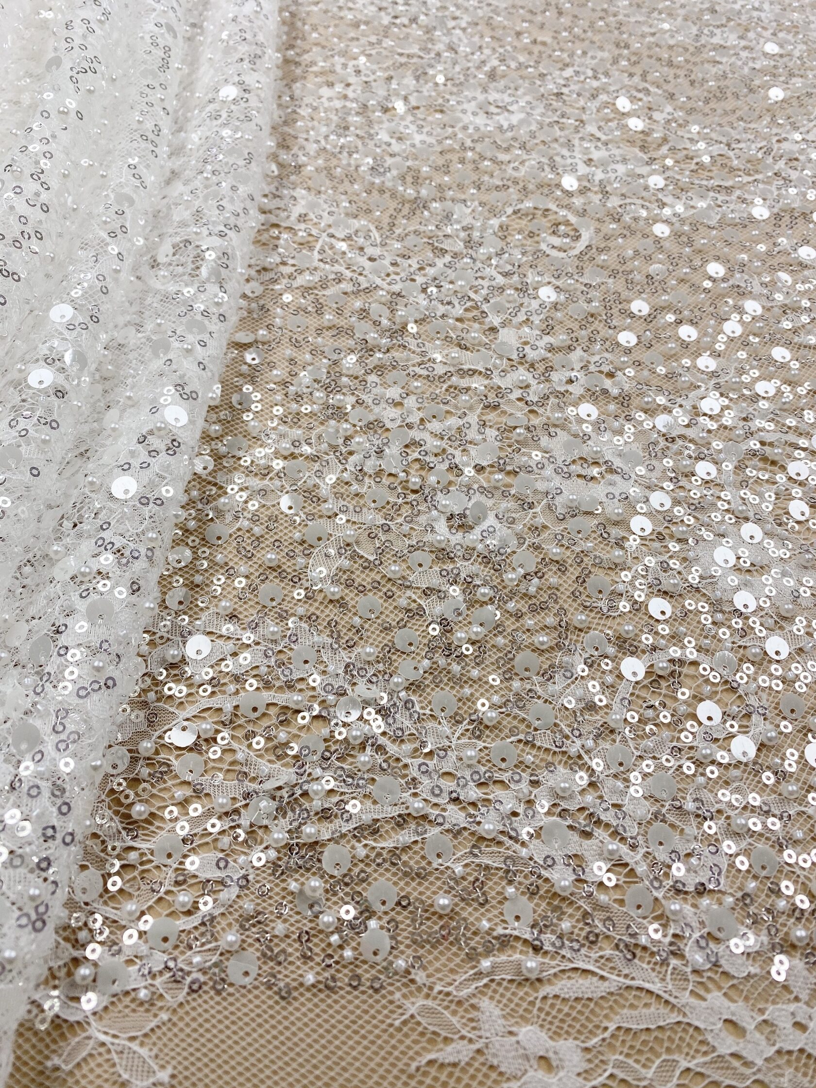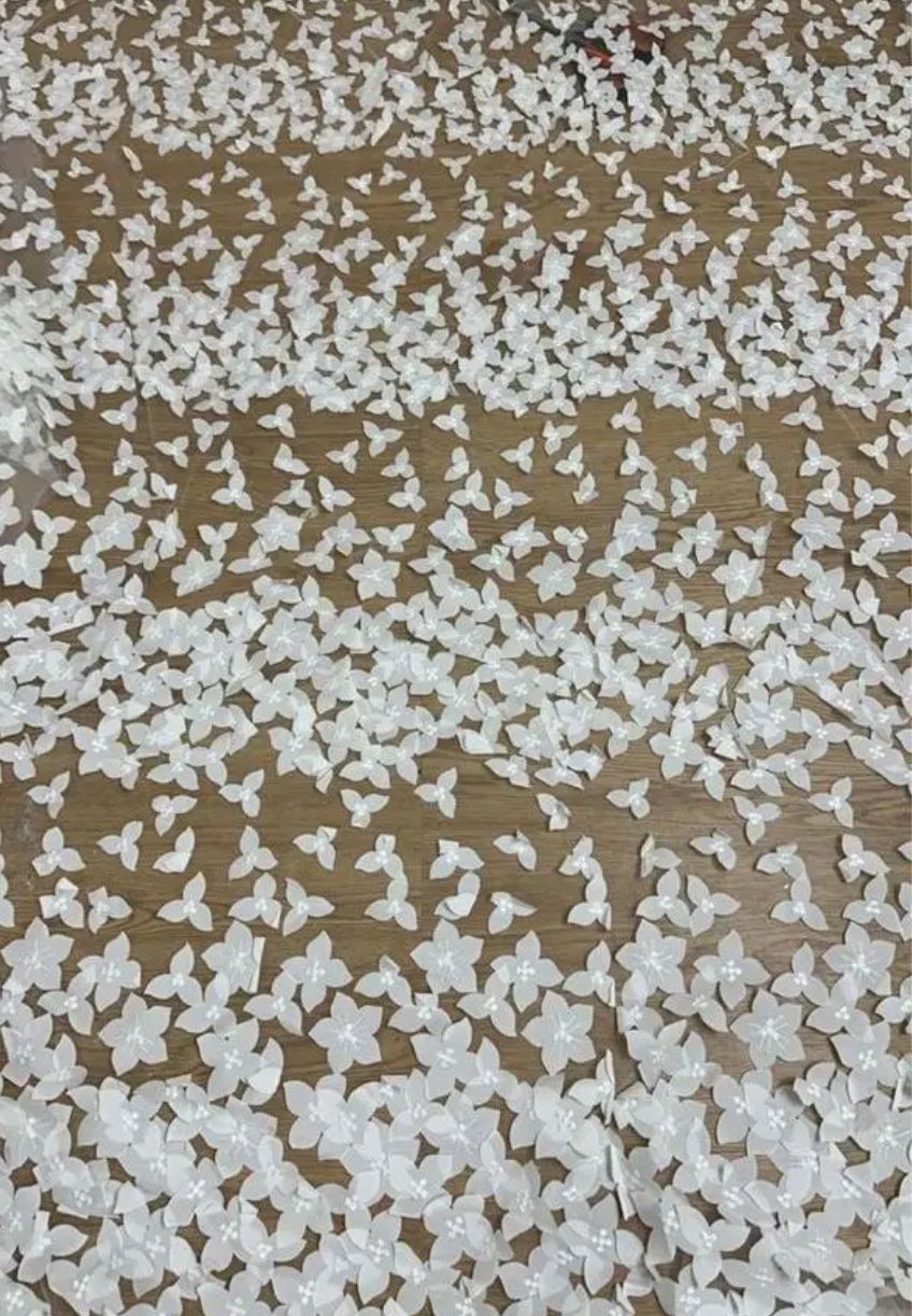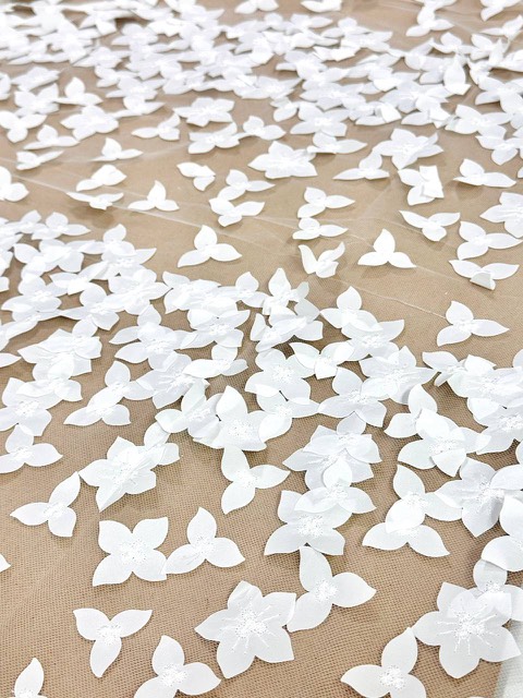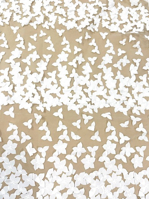 Вышивка, украшенная 3D цветами и 2D лепестками, расшитая жемчужными бусинами Цвет: молочный Режем от 1 раппорта - 0.34м Ширина - 1.43м (с сеткой 1.55м)