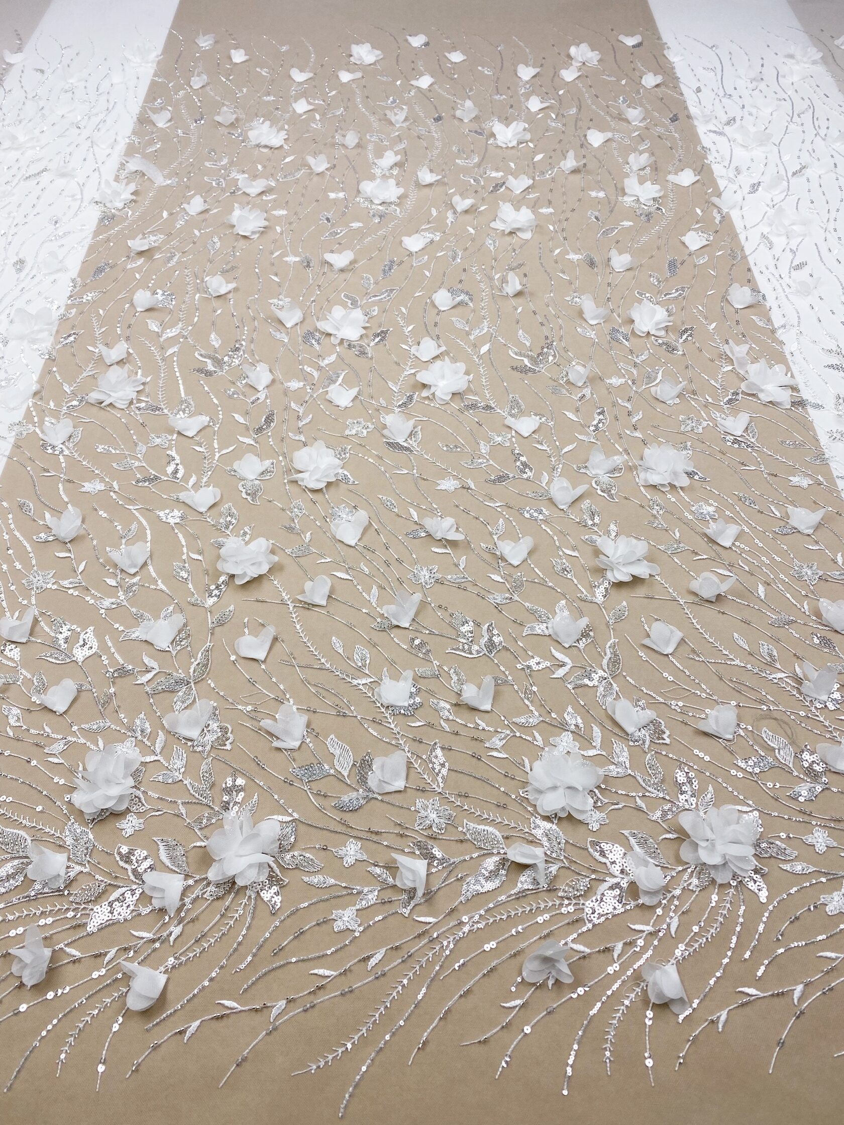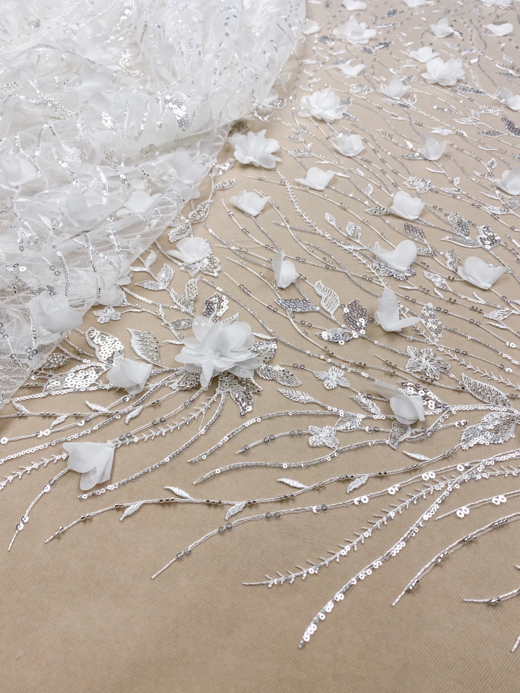 Вышивка в молочном цвете, расшитая 3D цветами и лепестками, бисером тёплое серебро, прозрачно-зеркальными пайетками и микропайетками на молочной сетке Цвет: молочный Ширина - 135 см