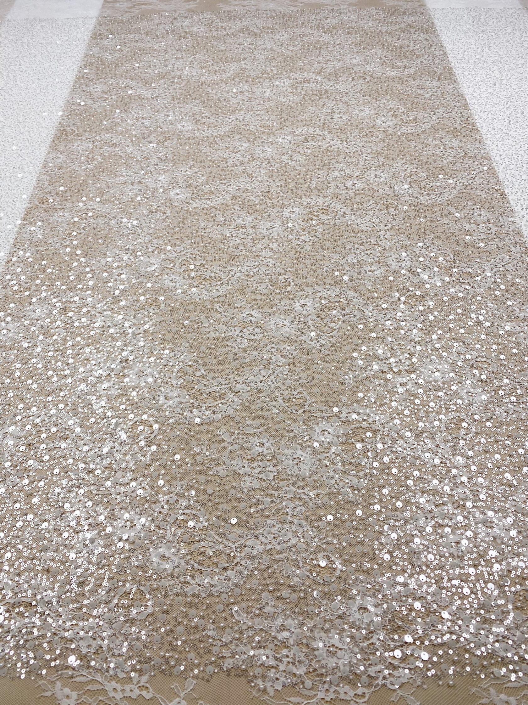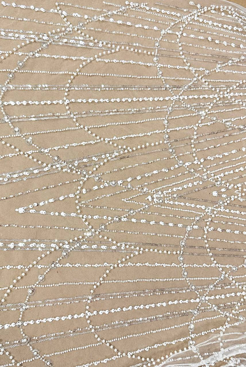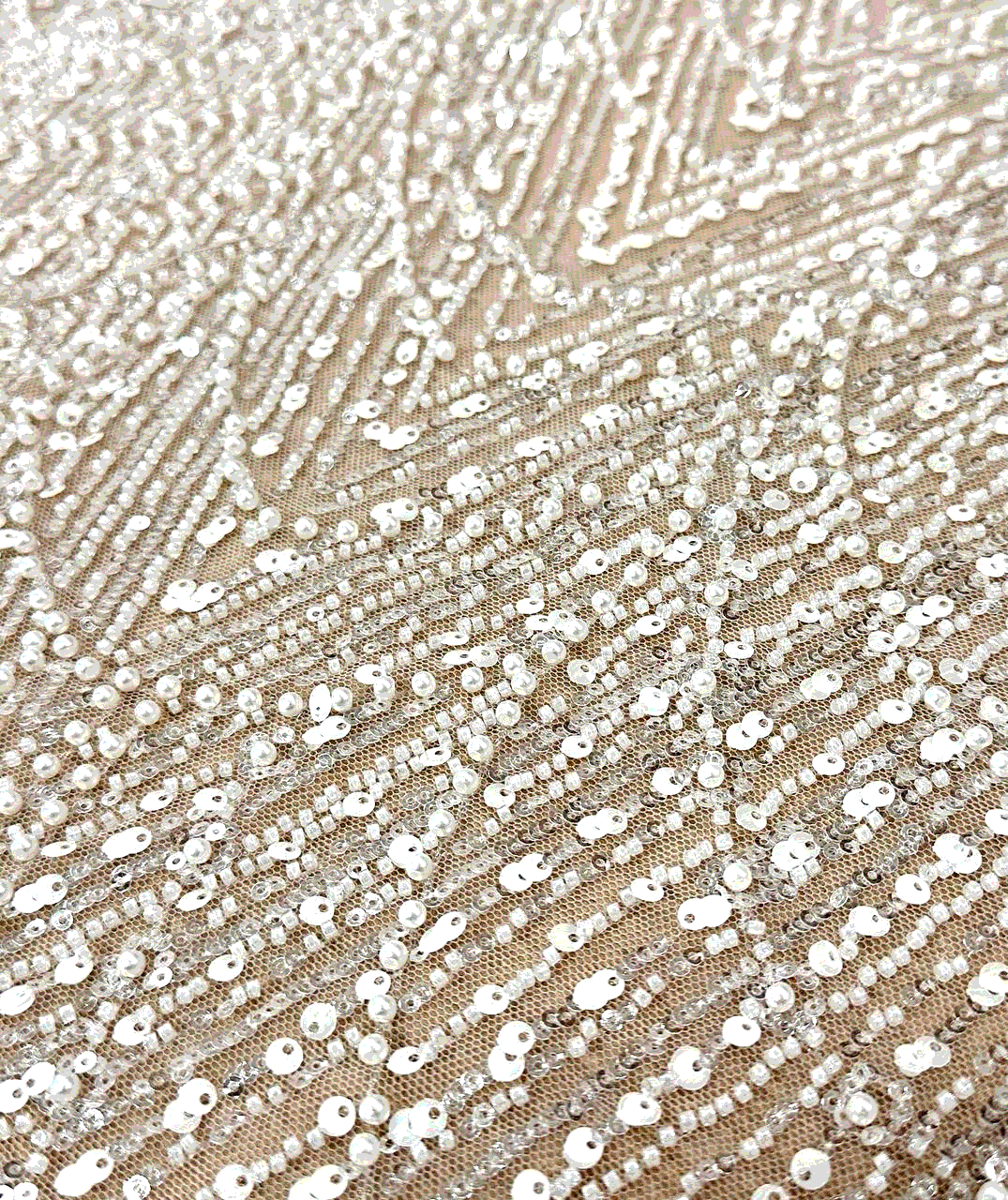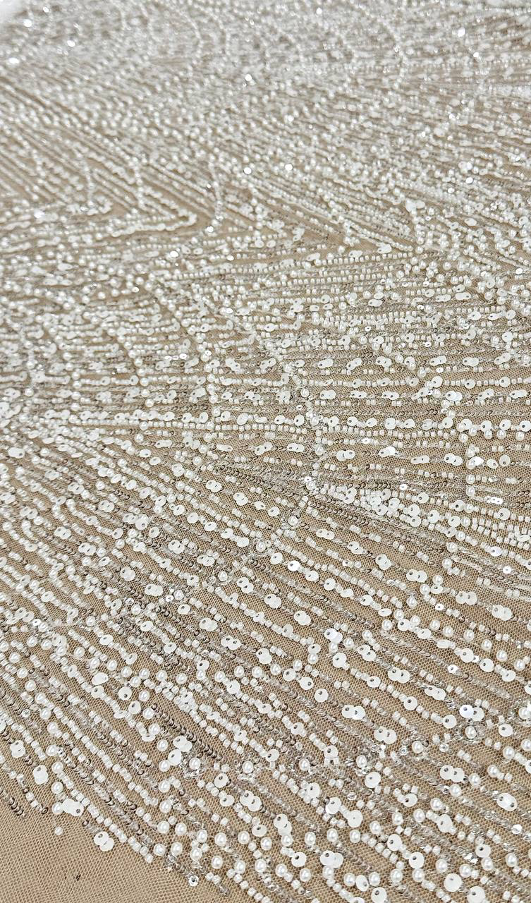 Сетка с дизайном «Цепочки», украшенная бусинами, бисером с серединкой тёплое серебро и пайетками двух размеров Ширина - 1.36м / (с сеткой - 1.62м) Режем от 1 раппорта - 0.33м