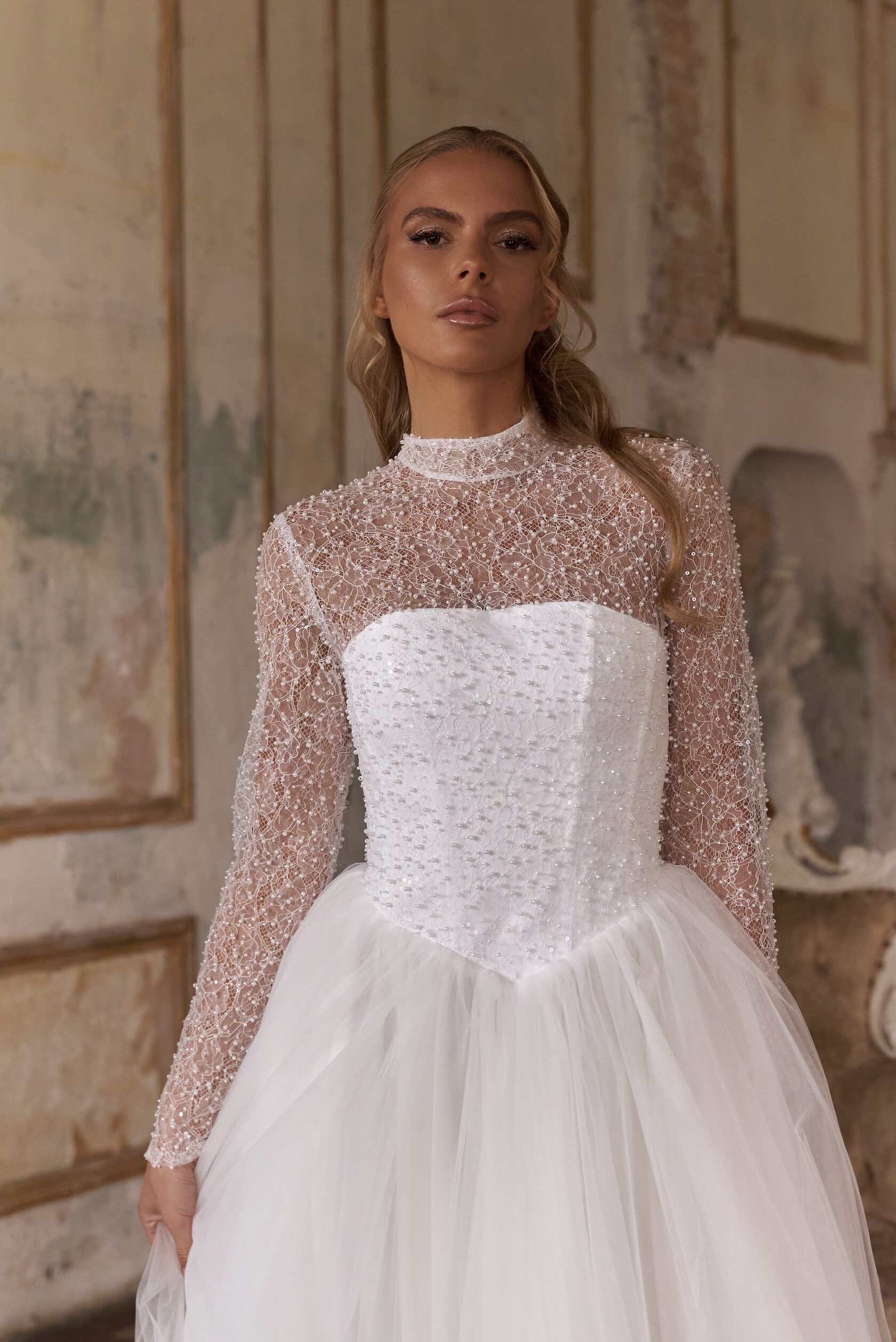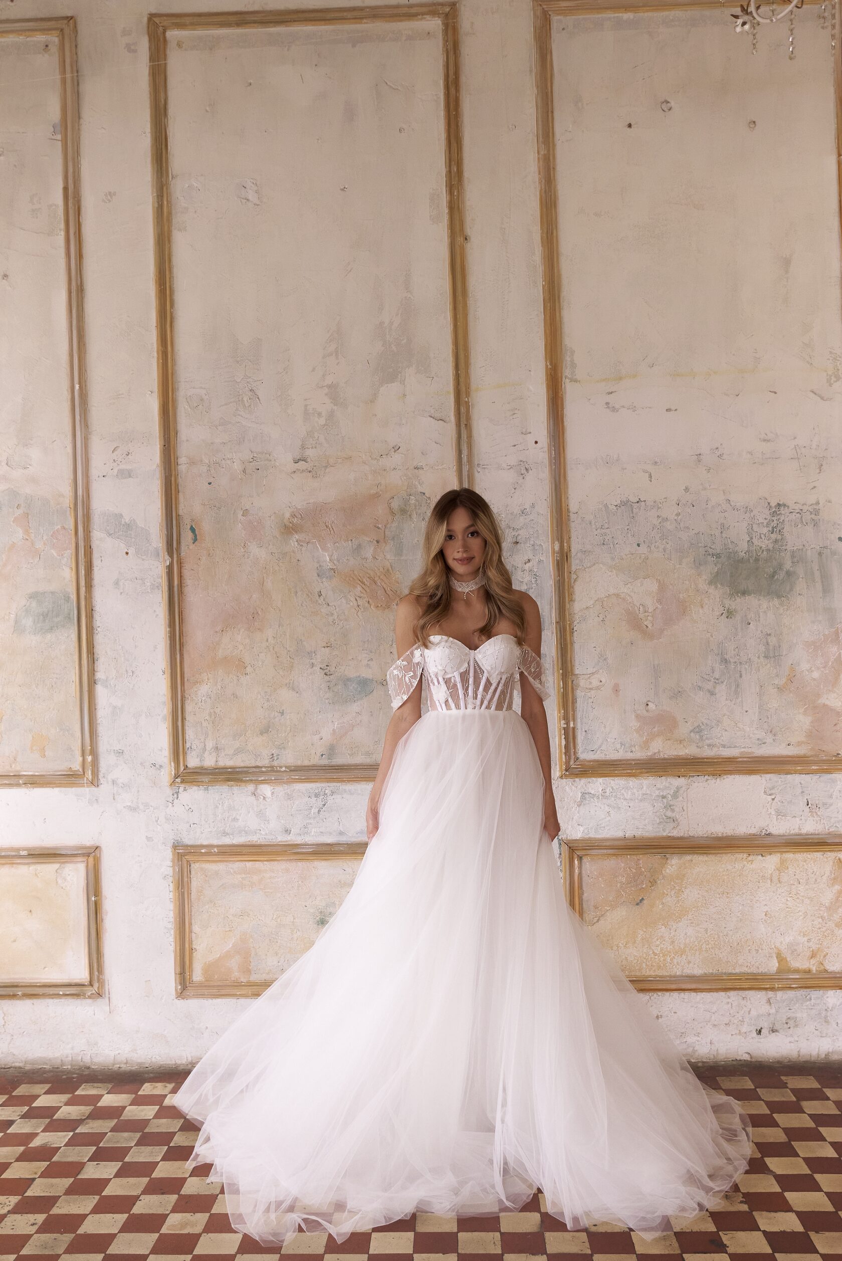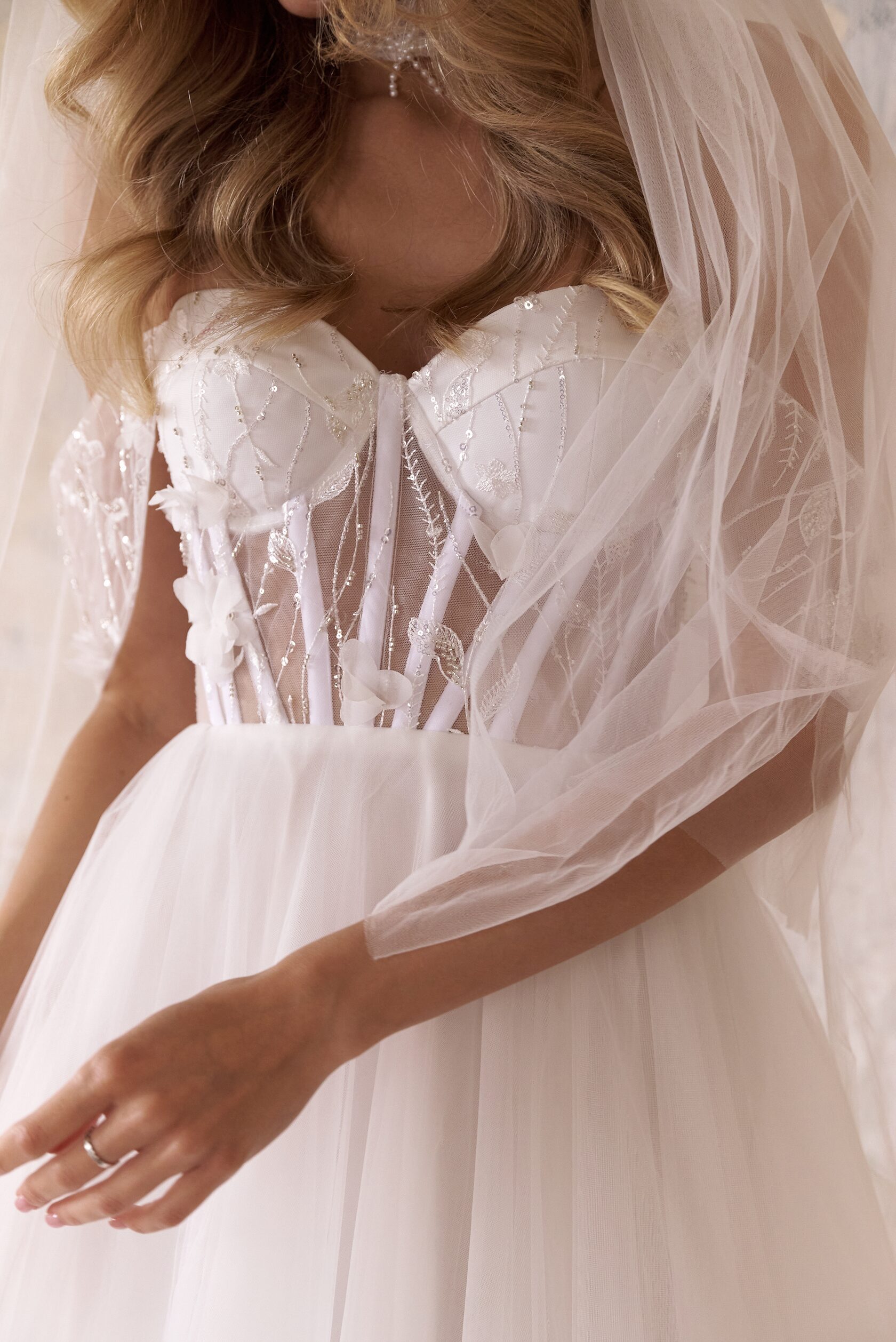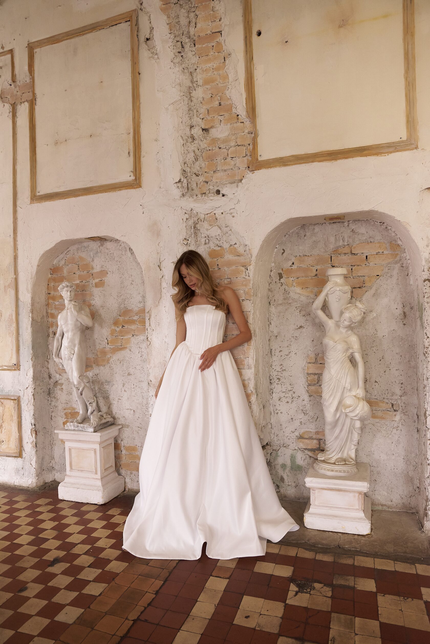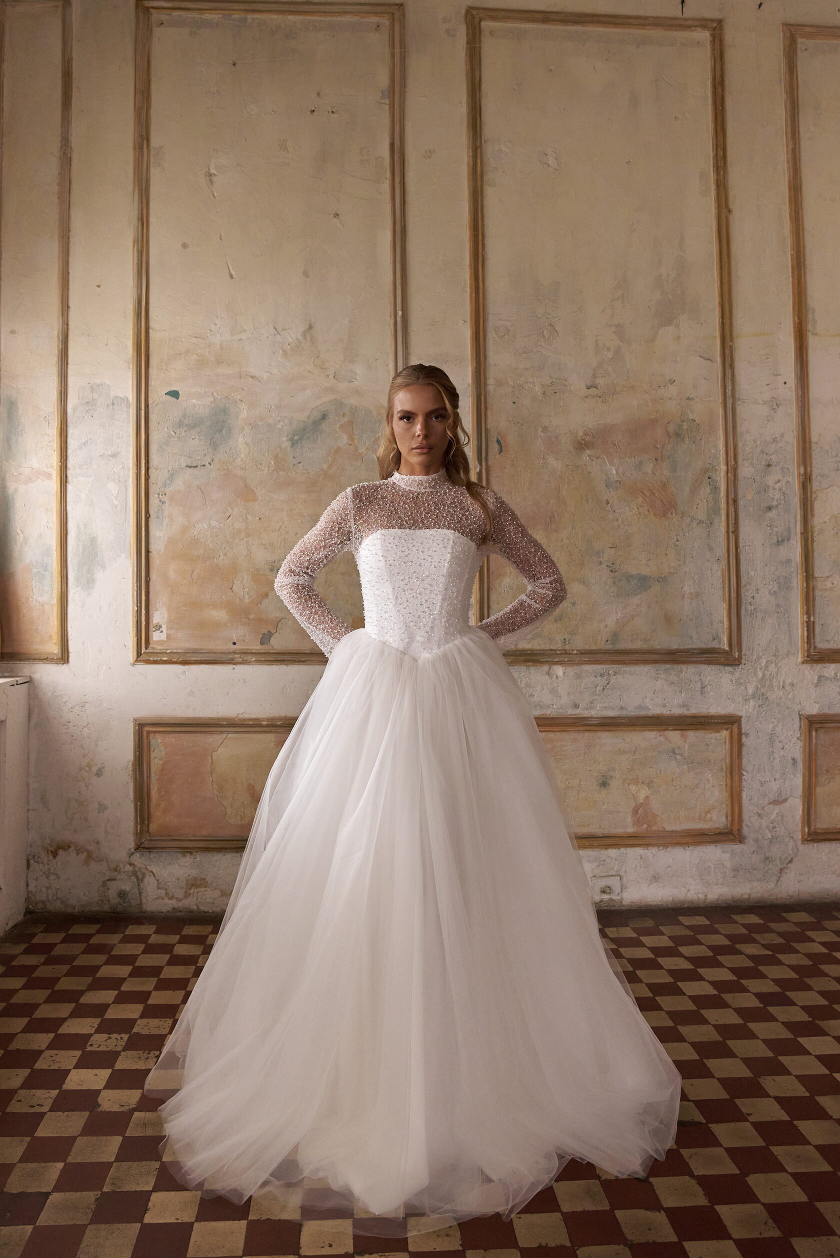 Эффектное пышное свадебное платье, разработанное с учетом главного тренда этого сезона – выразительного треугольного корсета, декорированного жемчугом. Этот роскошный наряд создан для невест, стремящихся создать запоминающийся, сказочный образ, сочетающий в себе классическую элегантность и современные тенденции.