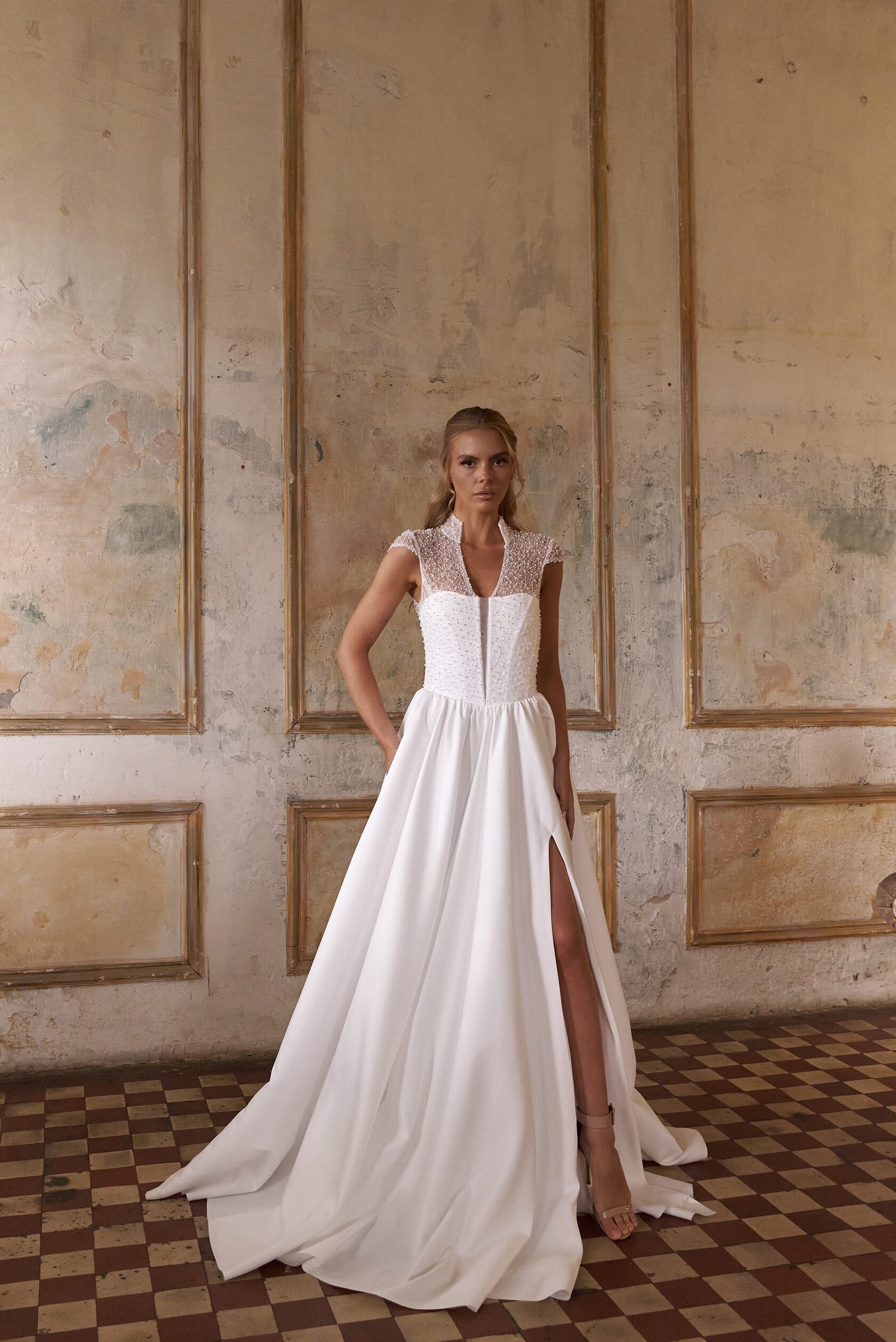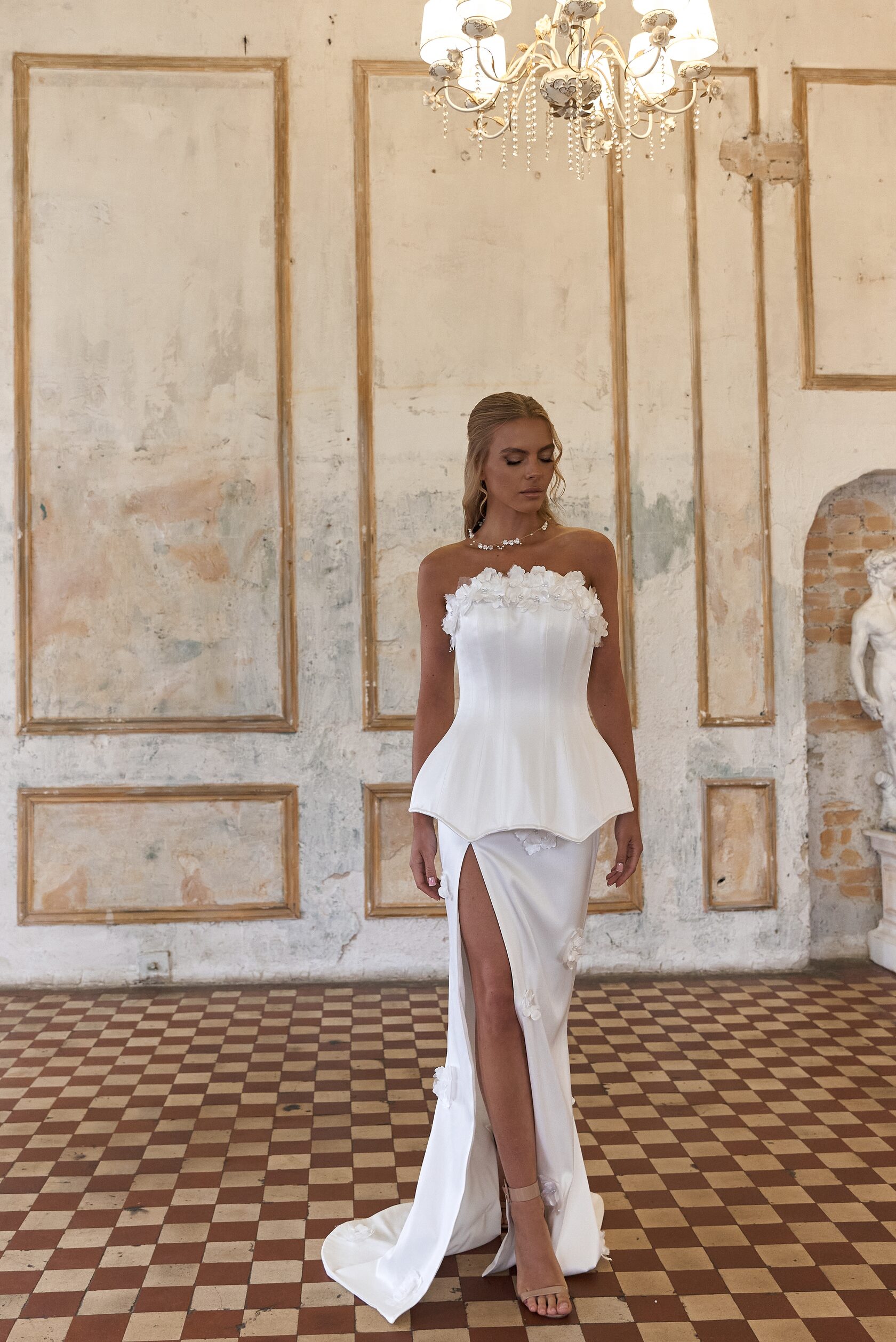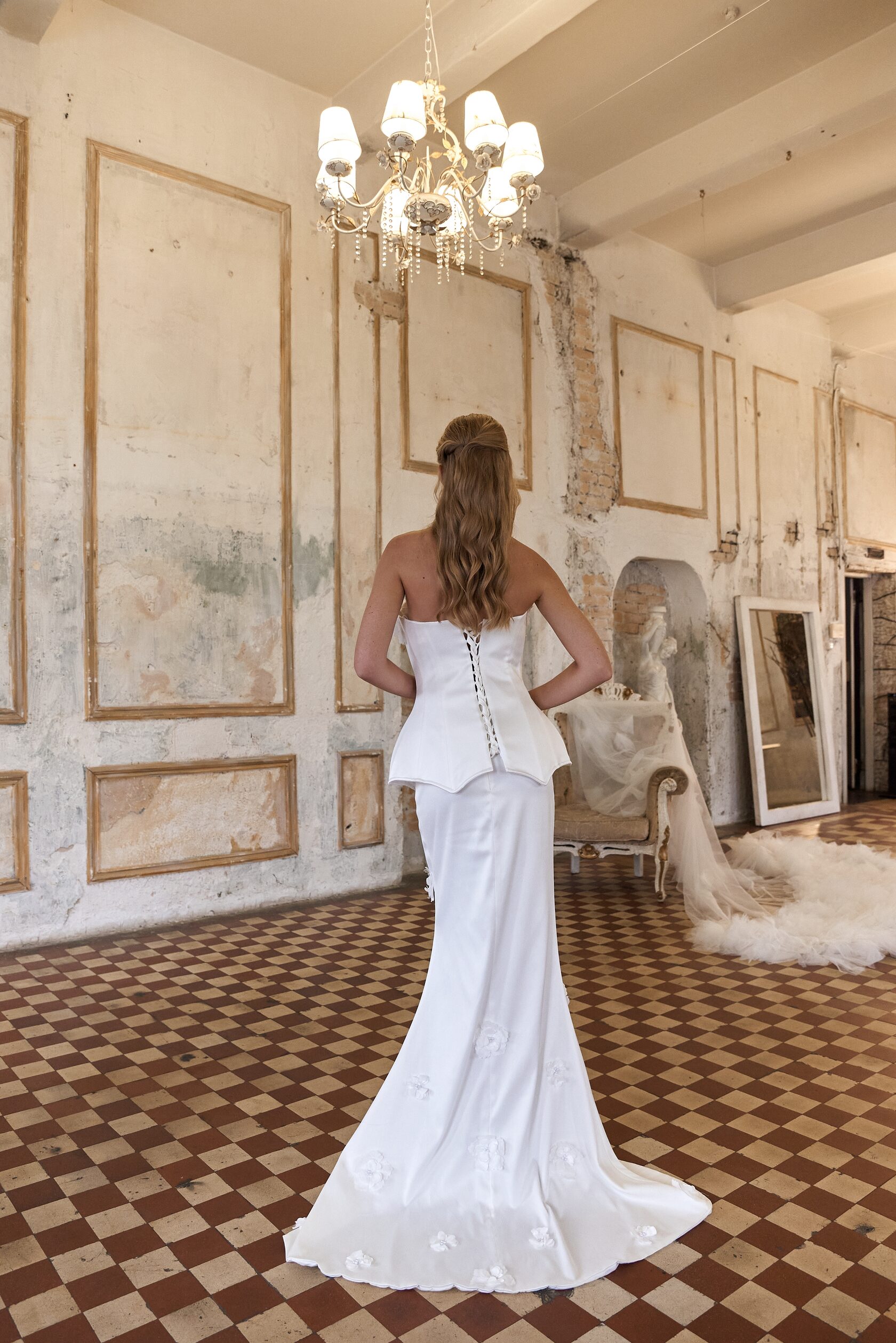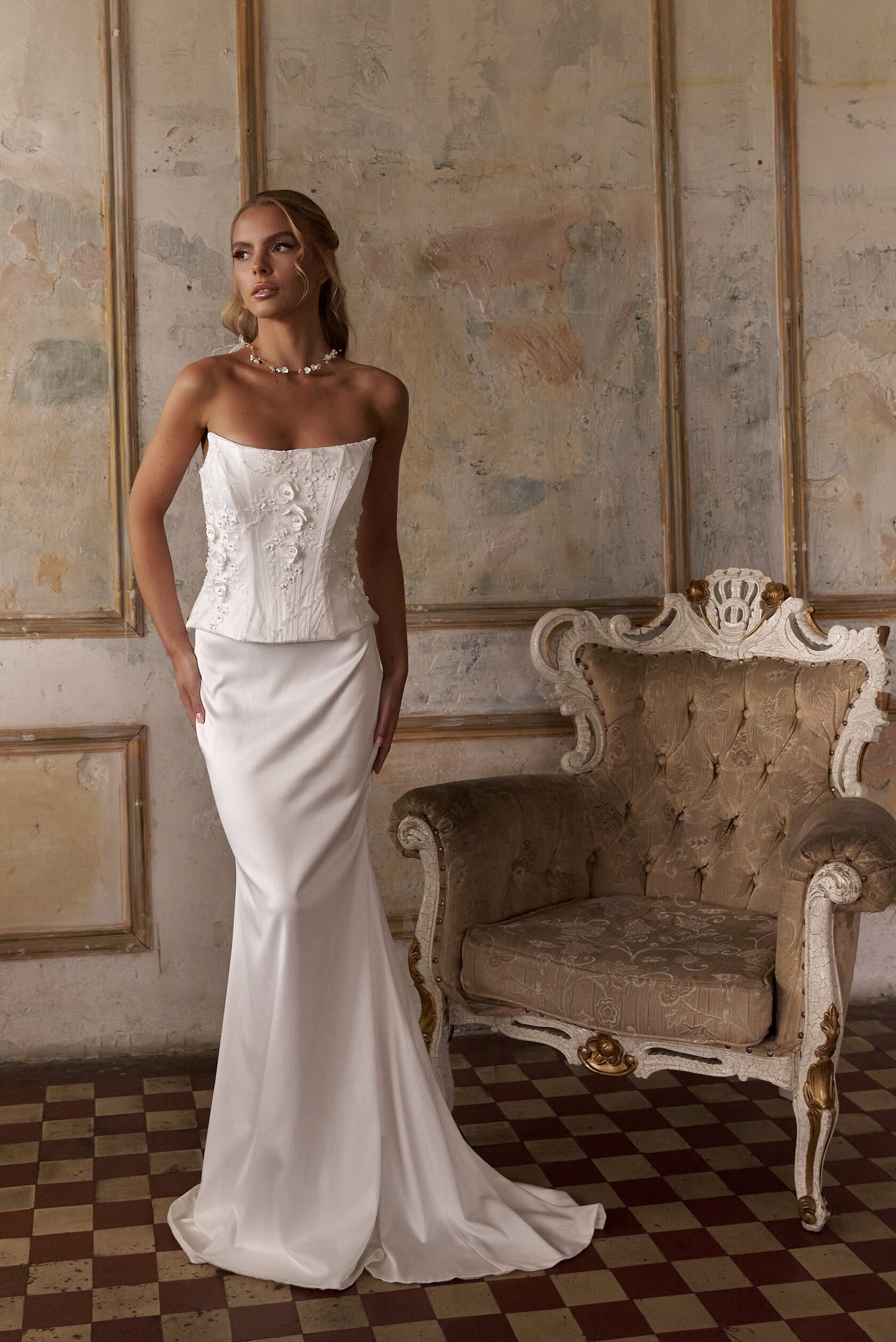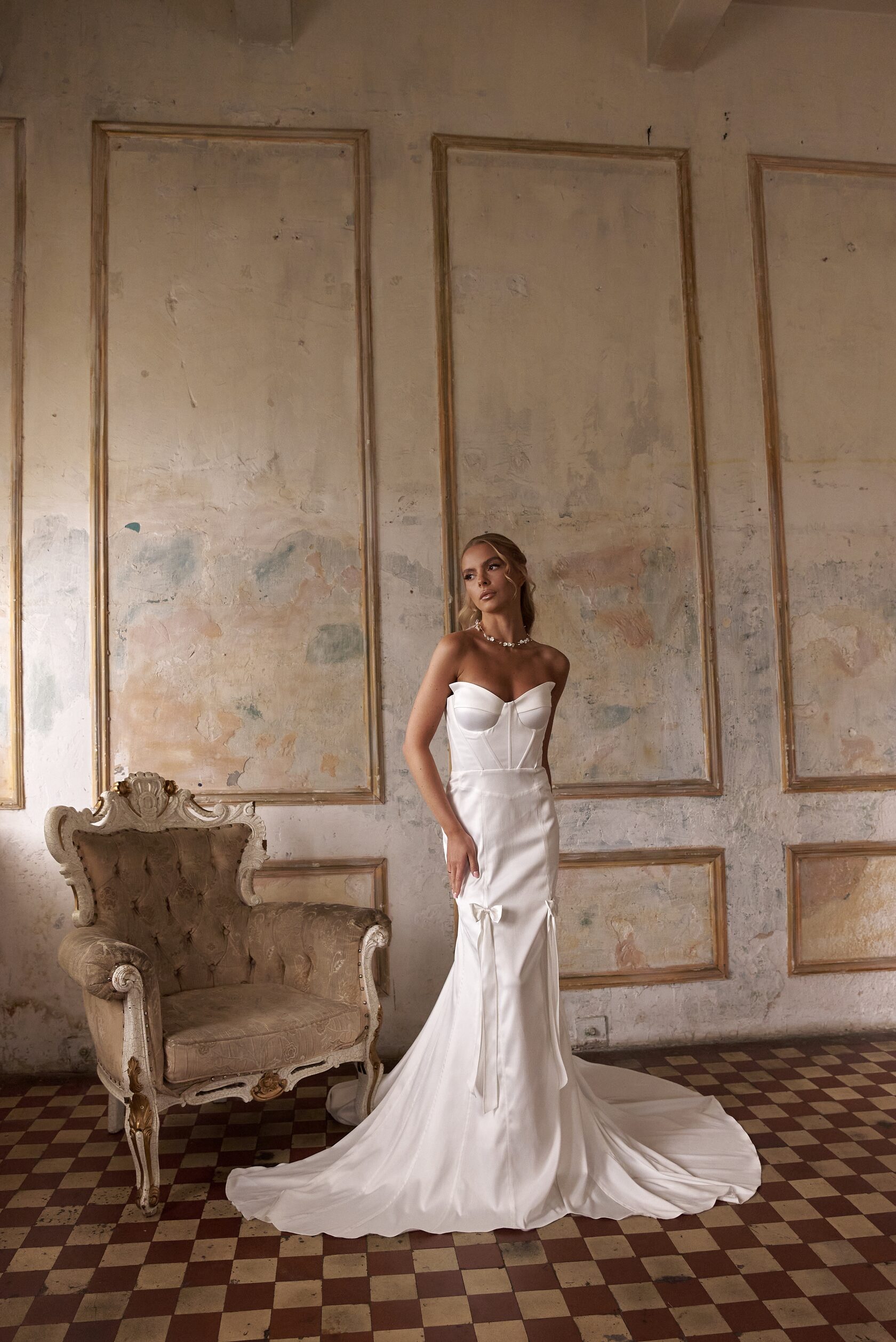 Эффектное пышное свадебное платье, разработанное с учетом главного тренда этого сезона – выразительного треугольного корсета, декорированного жемчугом. Этот роскошный наряд создан для невест, стремящихся создать запоминающийся, сказочный образ, сочетающий в себе классическую элегантность и современные тенденции.