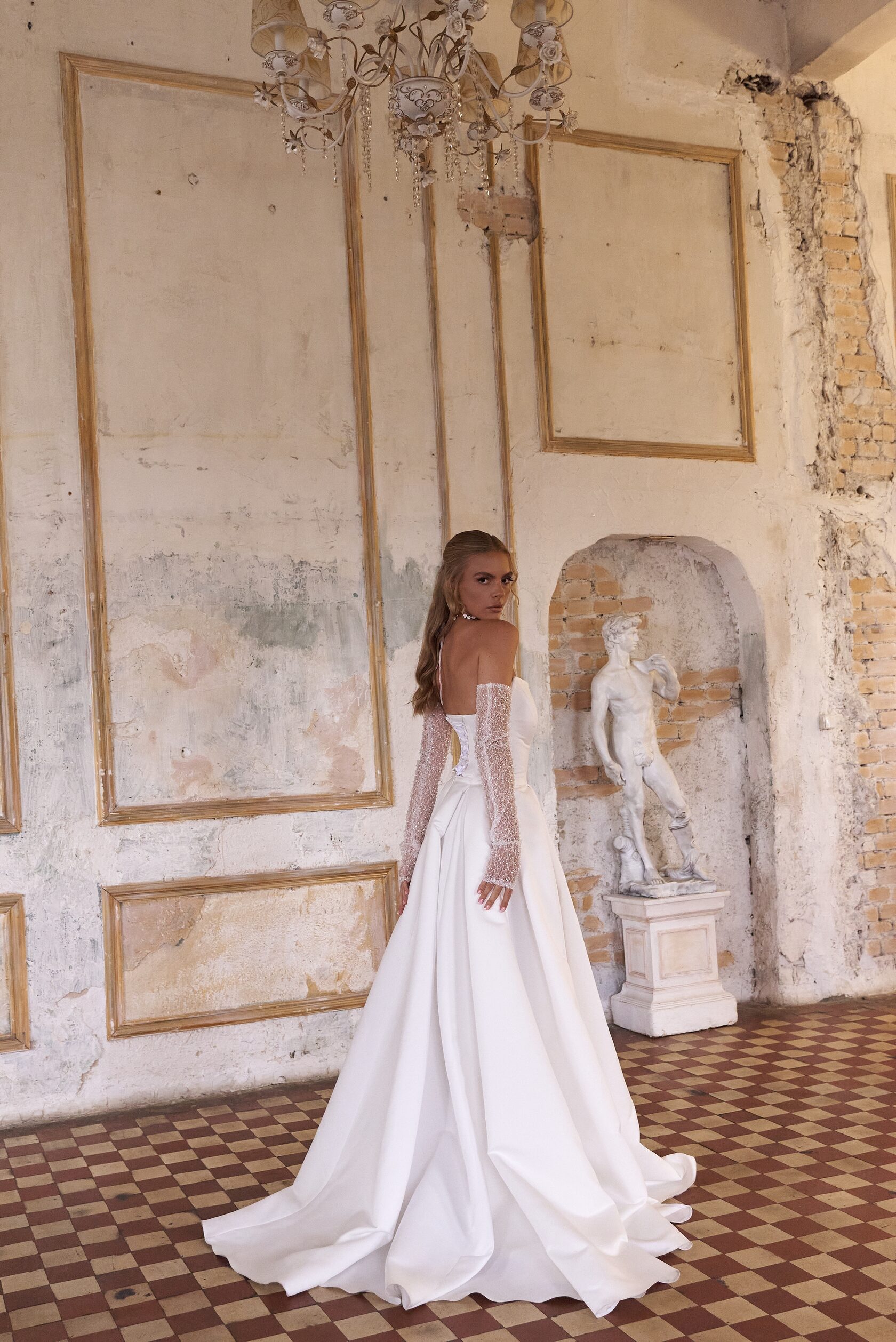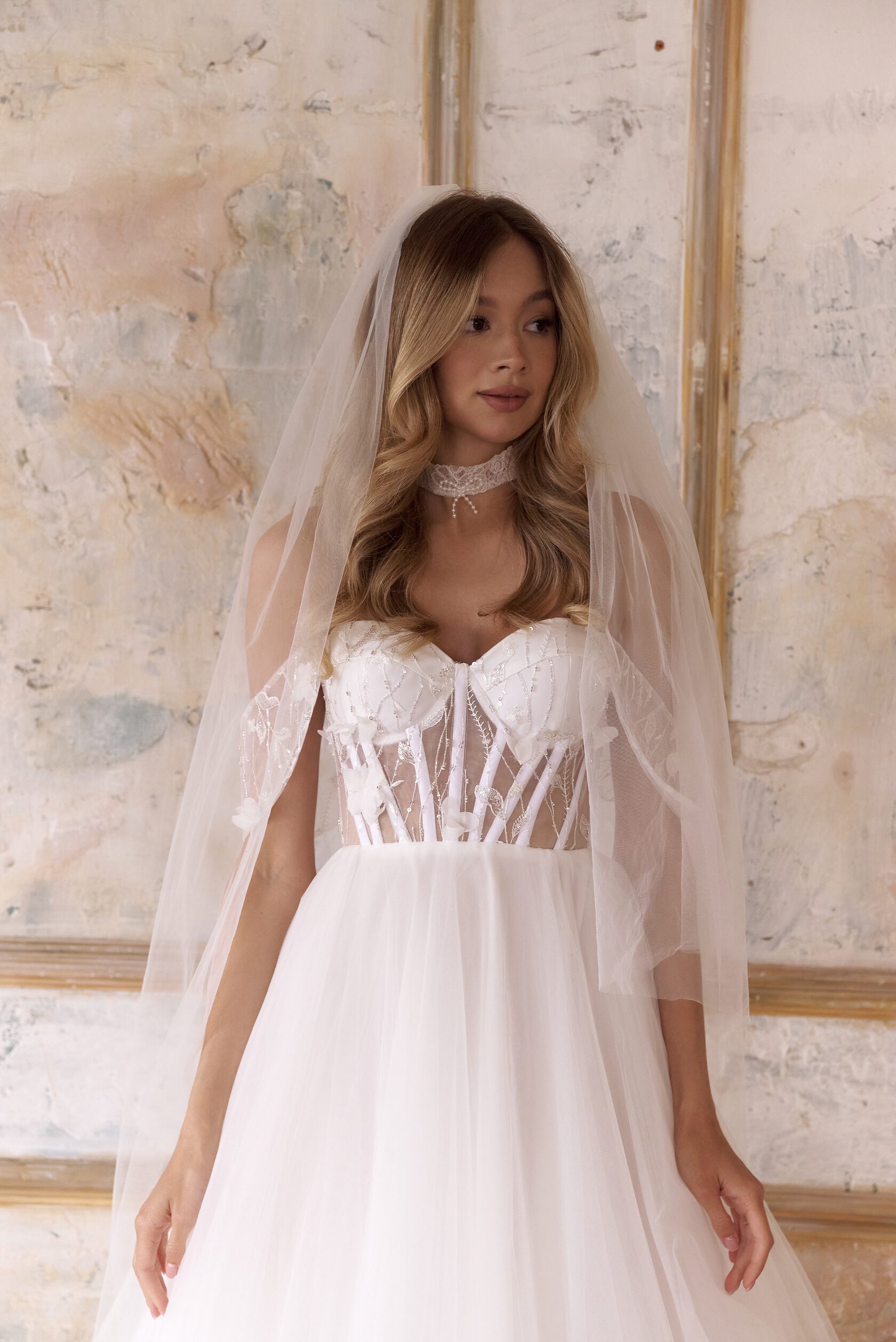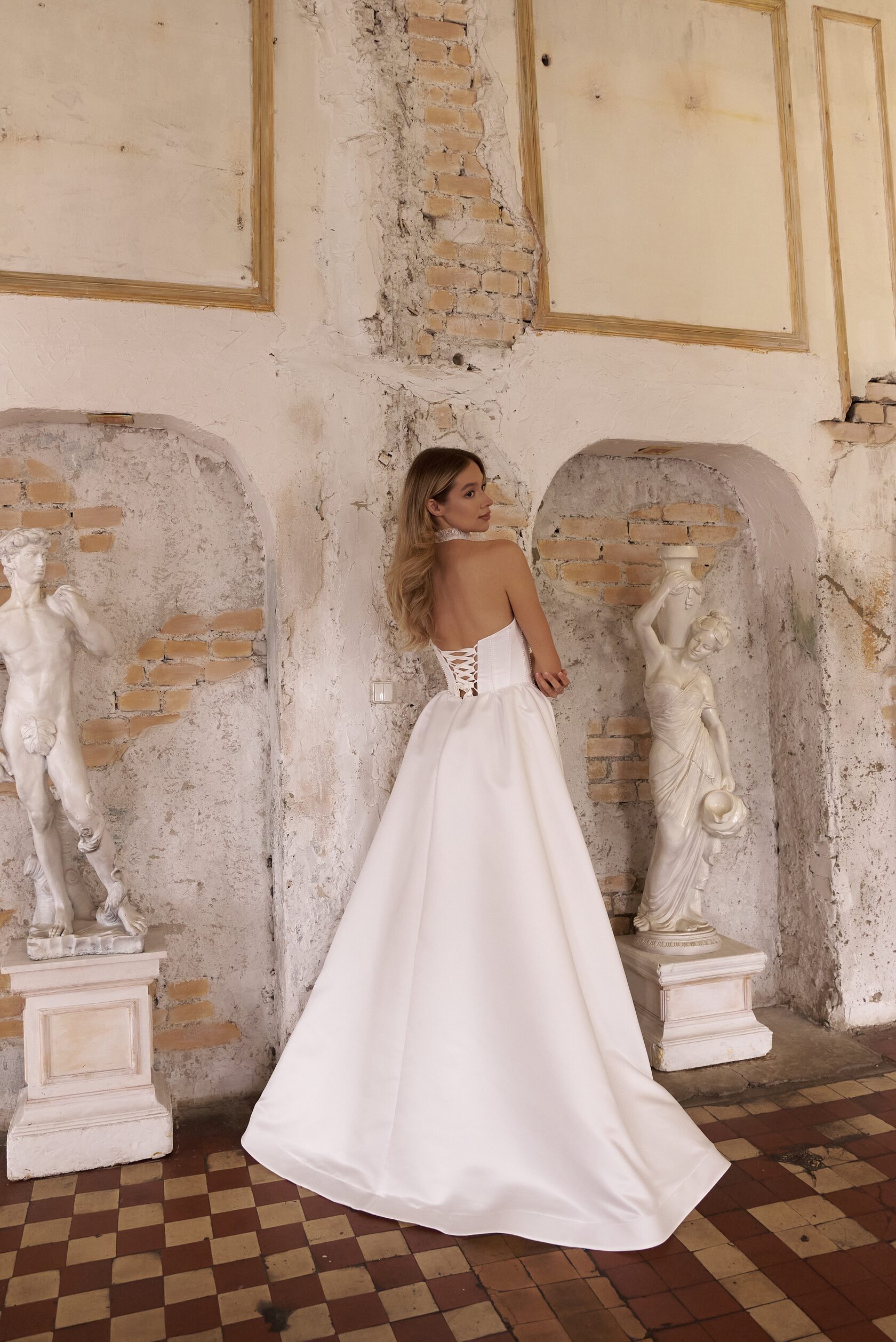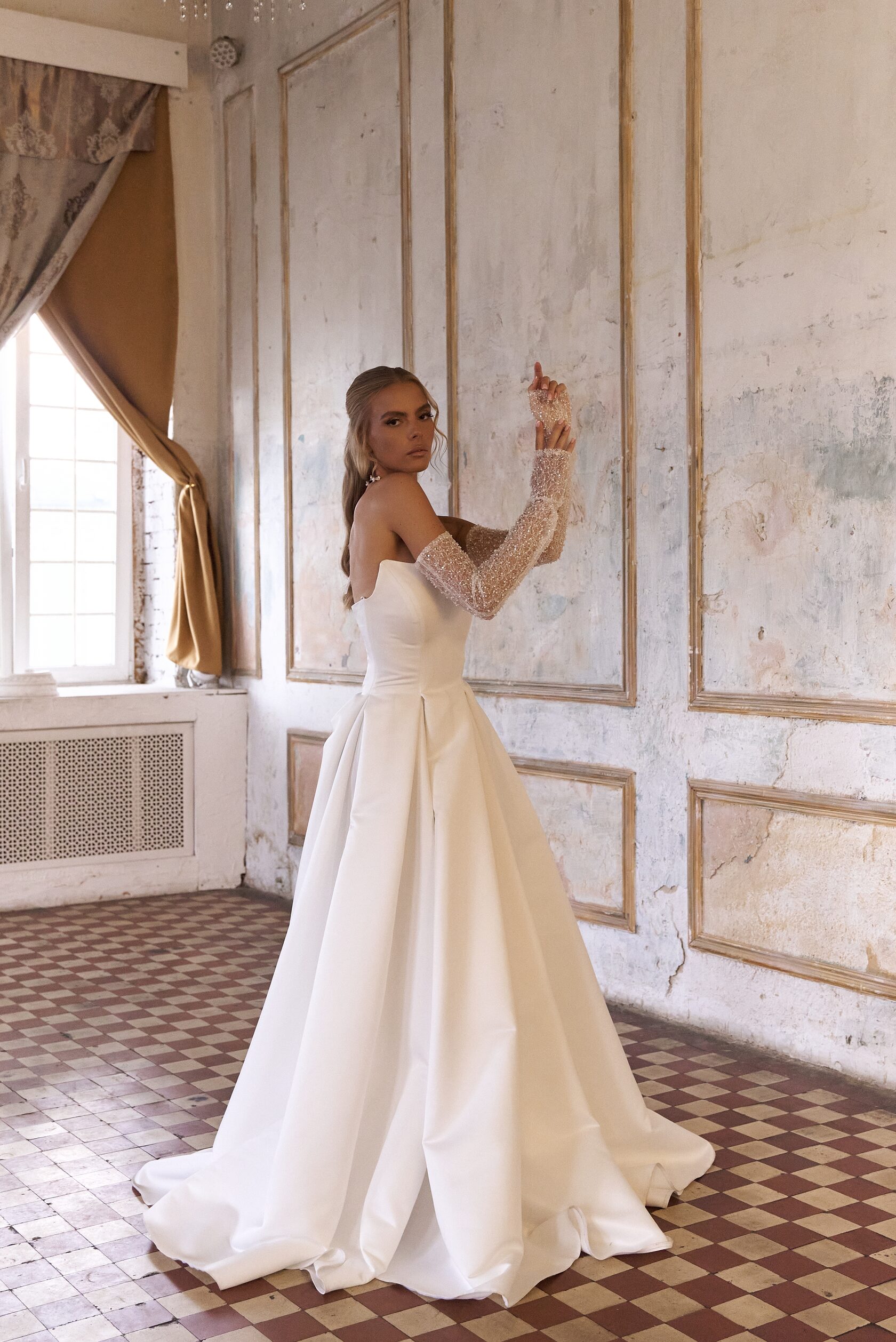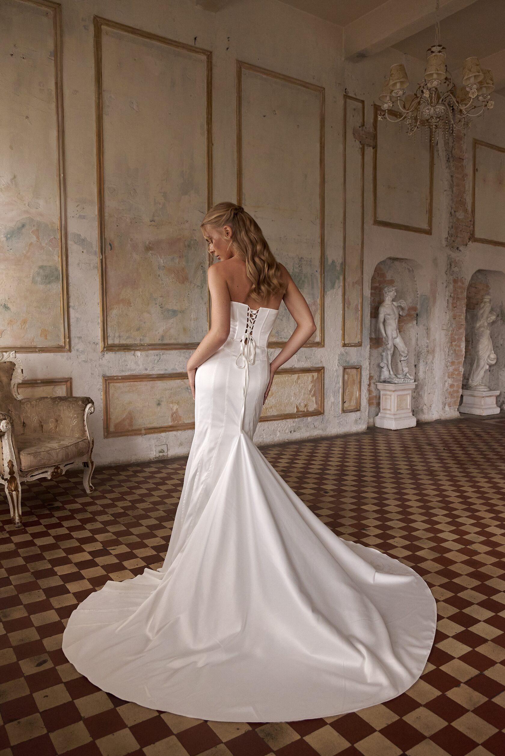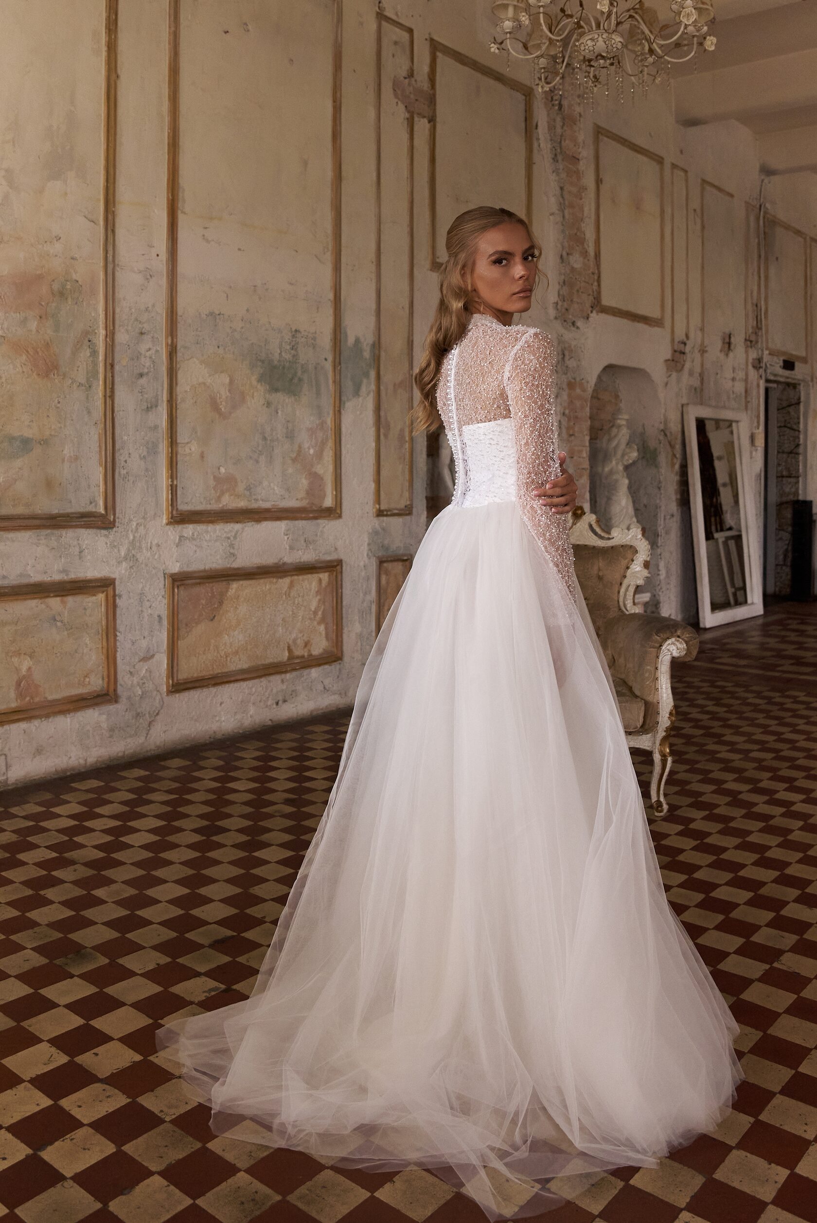 Эффектное пышное свадебное платье, разработанное с учетом главного тренда этого сезона – выразительного треугольного корсета, декорированного жемчугом. Этот роскошный наряд создан для невест, стремящихся создать запоминающийся, сказочный образ, сочетающий в себе классическую элегантность и современные тенденции.