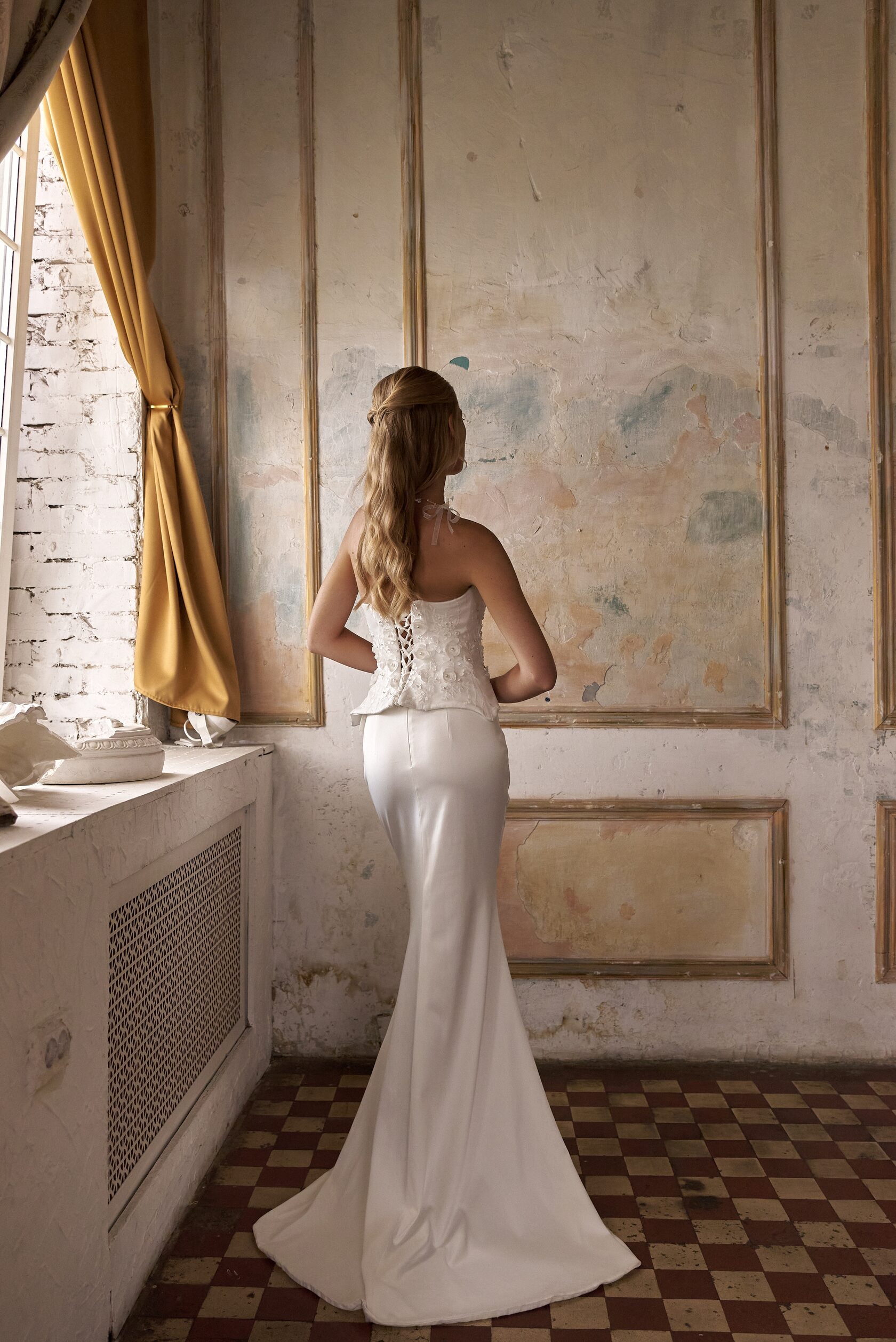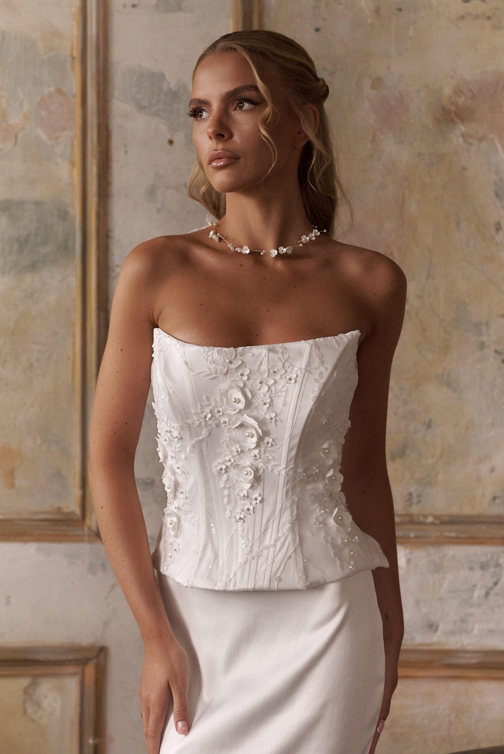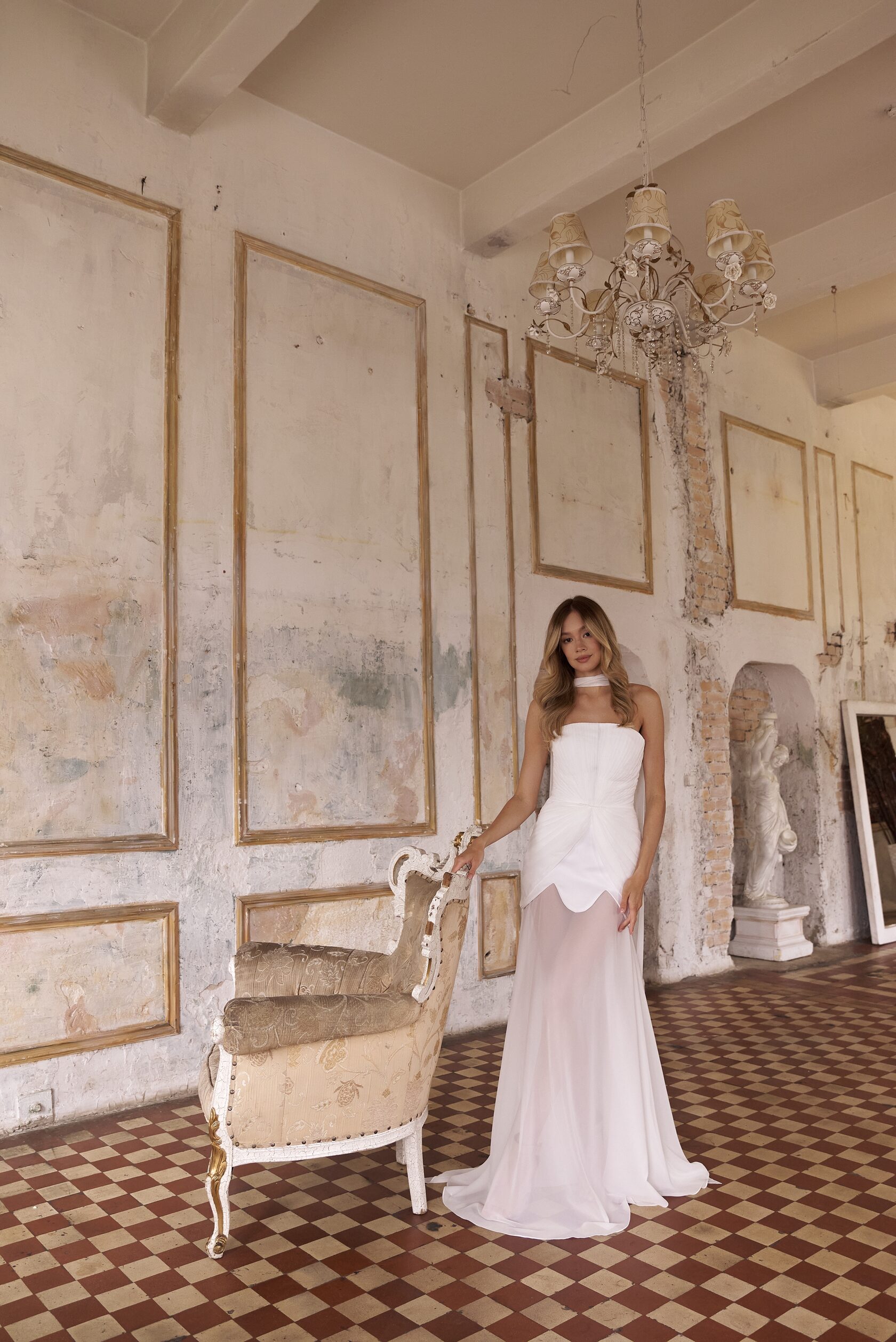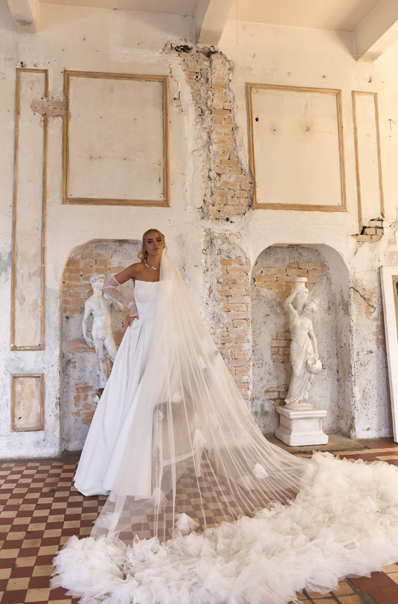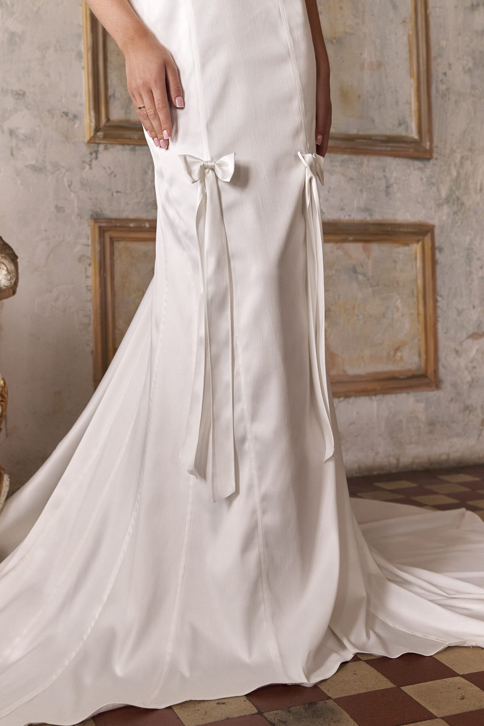 Эффектное пышное свадебное платье, разработанное с учетом главного тренда этого сезона – выразительного треугольного корсета, декорированного жемчугом. Этот роскошный наряд создан для невест, стремящихся создать запоминающийся, сказочный образ, сочетающий в себе классическую элегантность и современные тенденции.