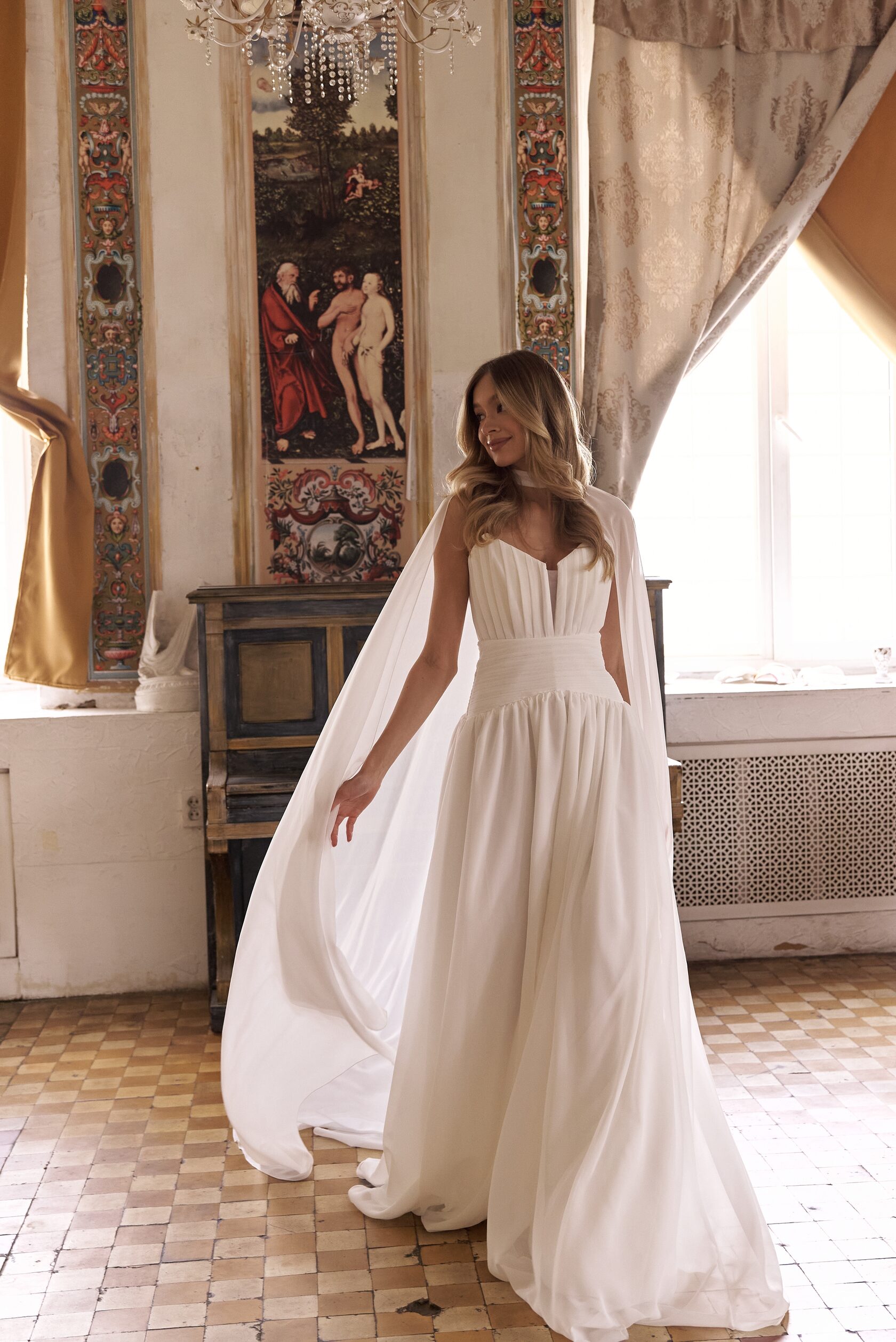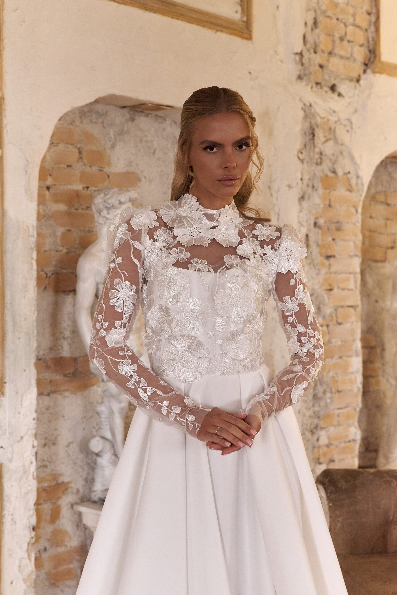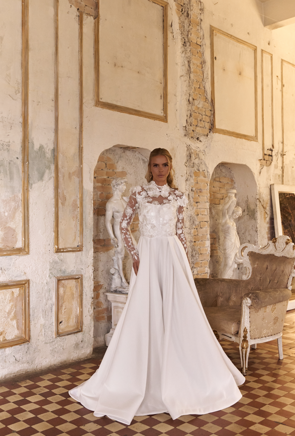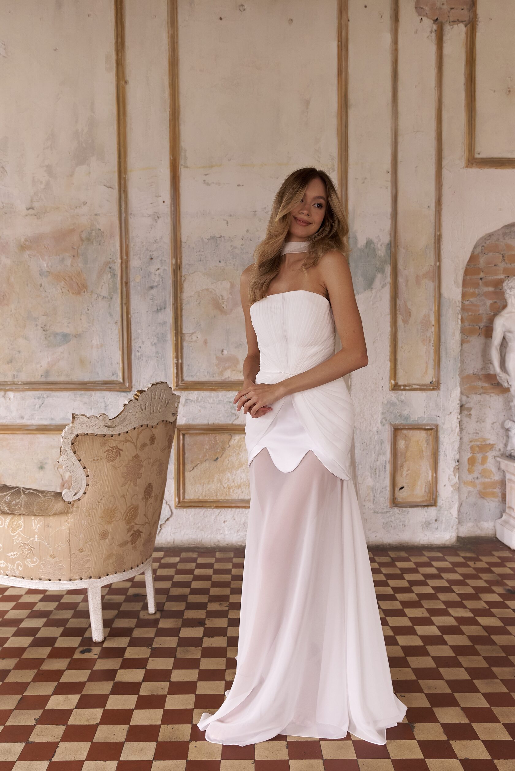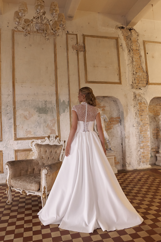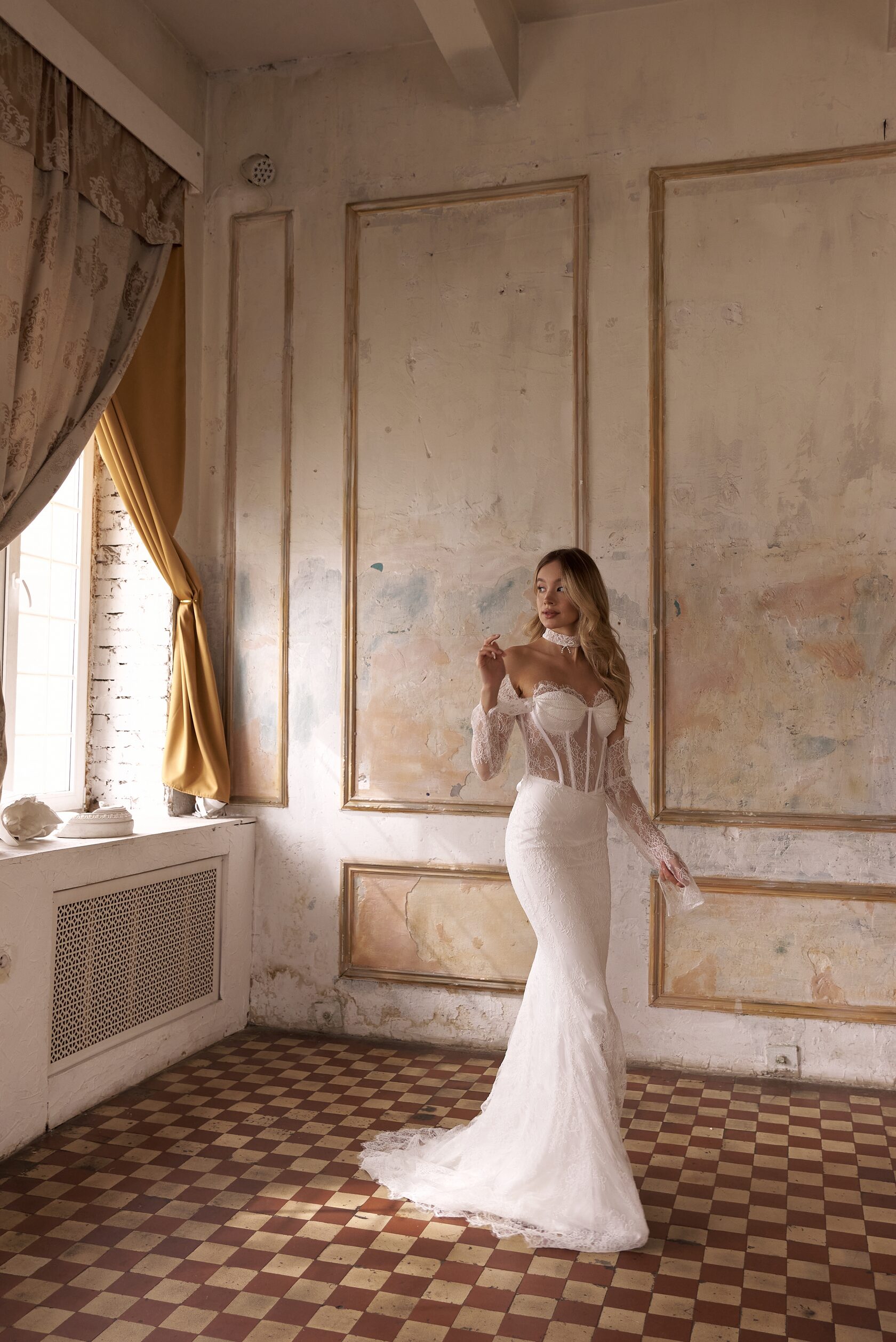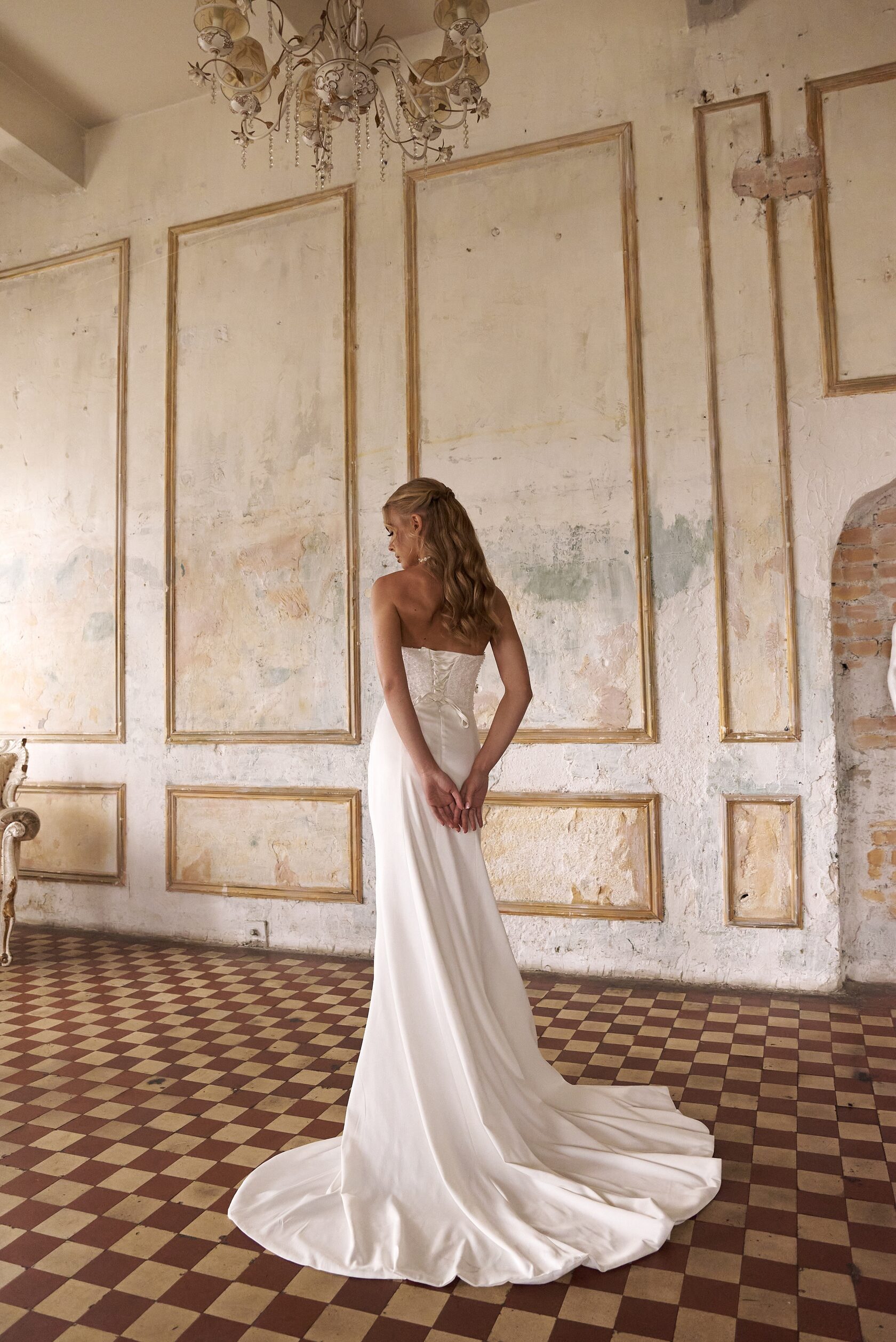 Эффектное пышное свадебное платье, разработанное с учетом главного тренда этого сезона – выразительного треугольного корсета, декорированного жемчугом. Этот роскошный наряд создан для невест, стремящихся создать запоминающийся, сказочный образ, сочетающий в себе классическую элегантность и современные тенденции.