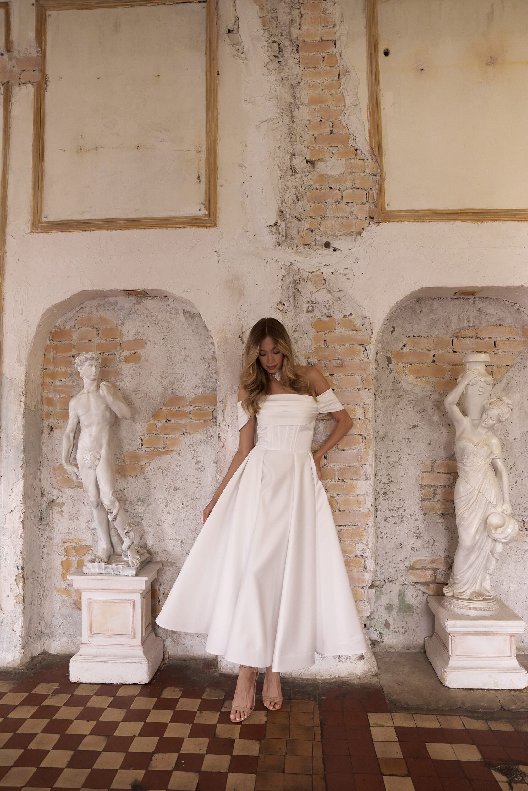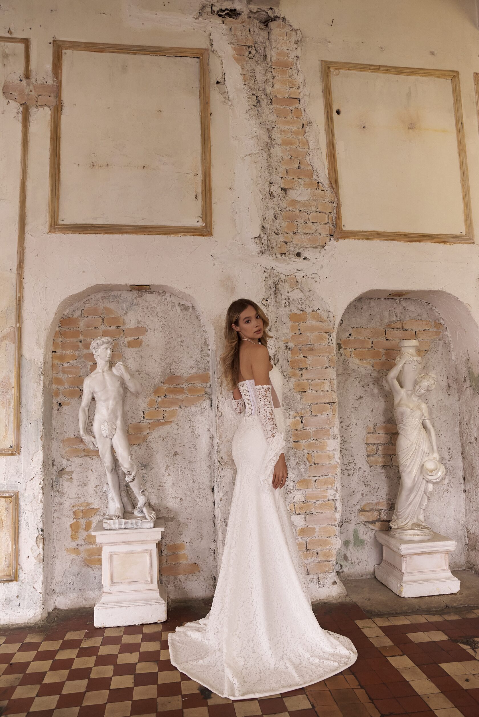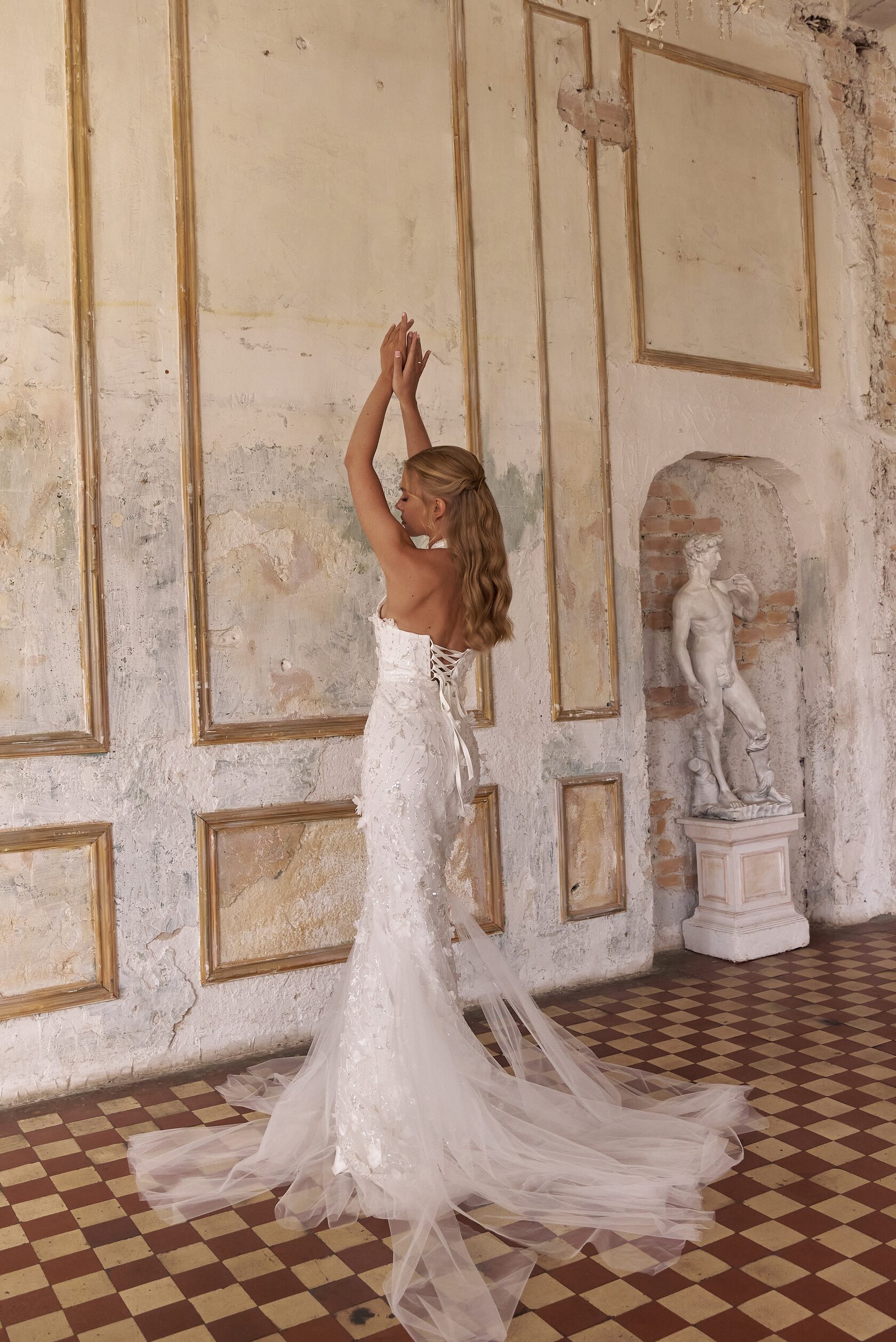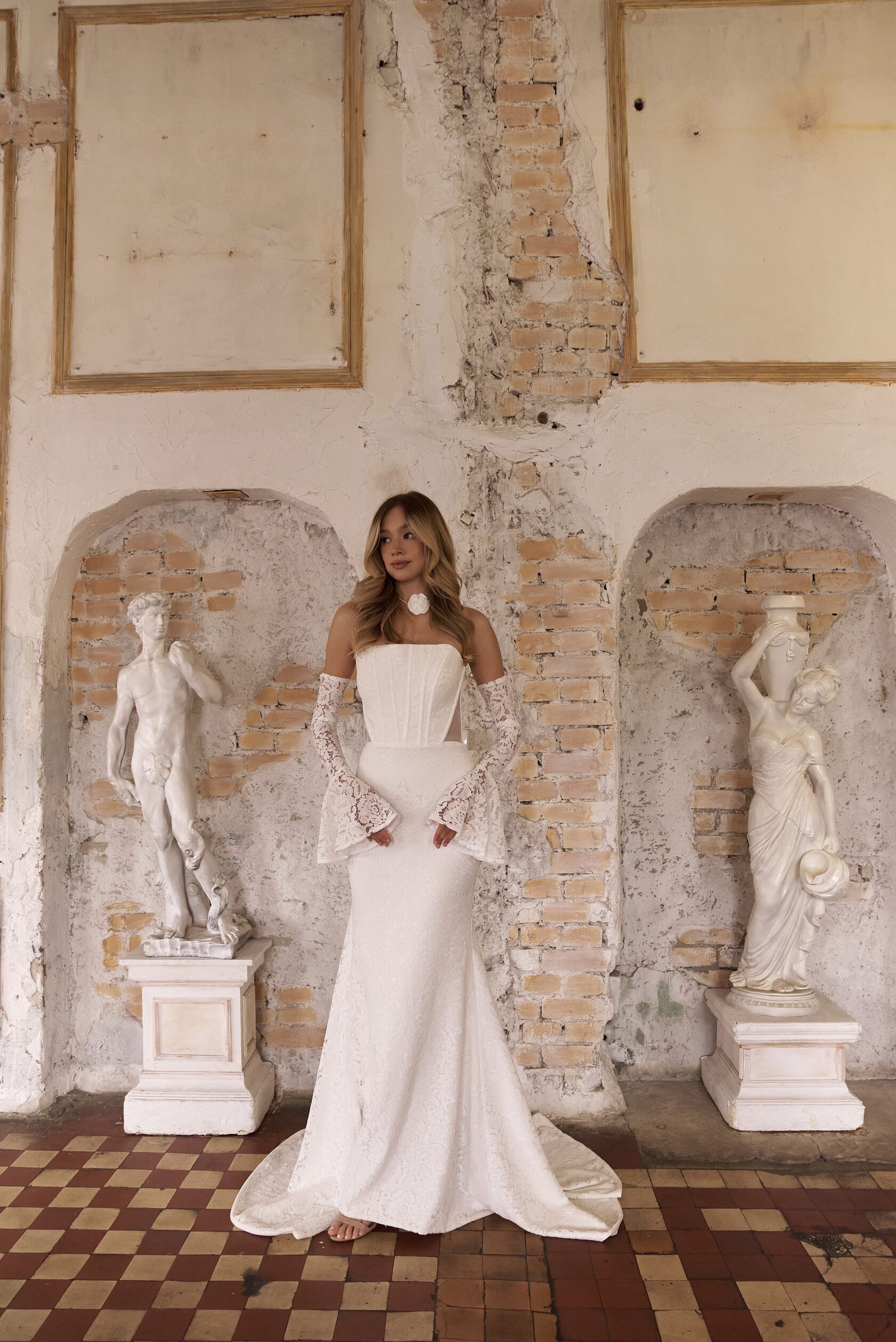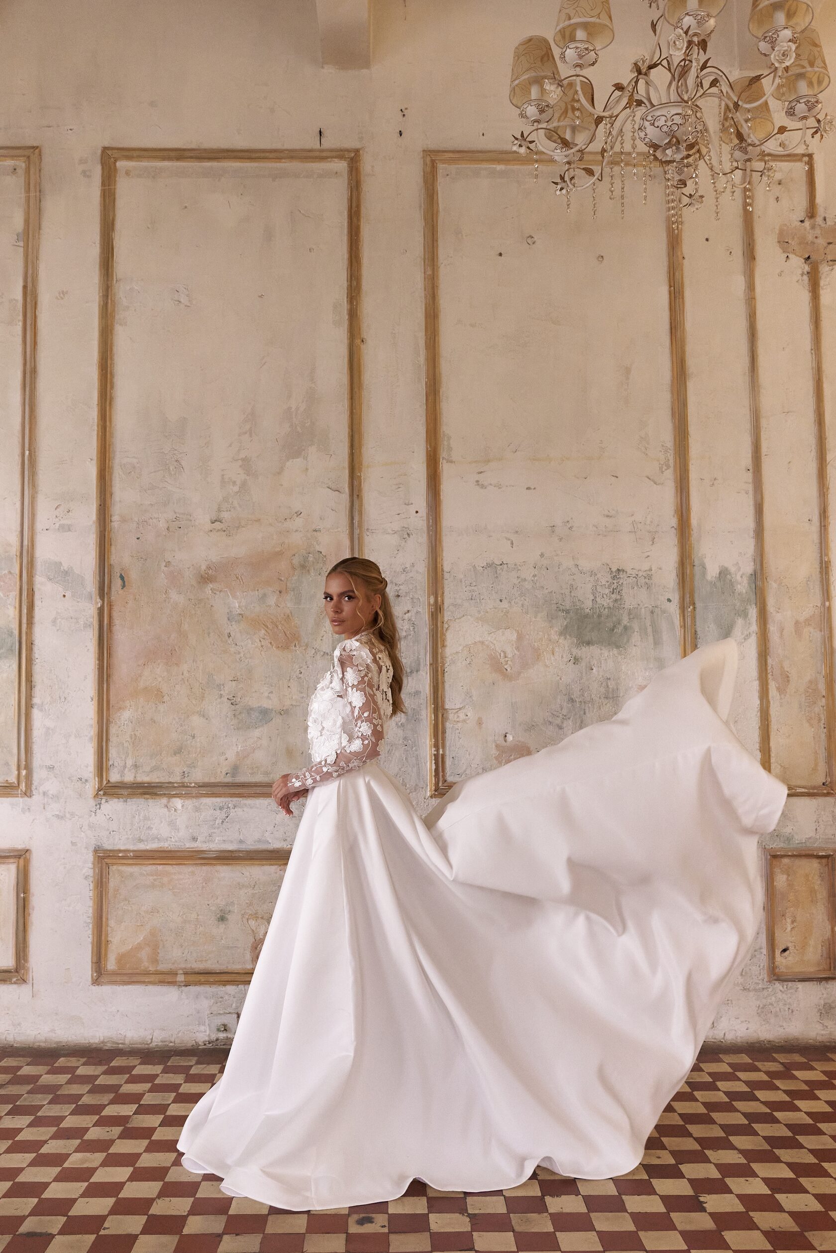 Эффектное пышное свадебное платье, разработанное с учетом главного тренда этого сезона – выразительного треугольного корсета, декорированного жемчугом. Этот роскошный наряд создан для невест, стремящихся создать запоминающийся, сказочный образ, сочетающий в себе классическую элегантность и современные тенденции.
