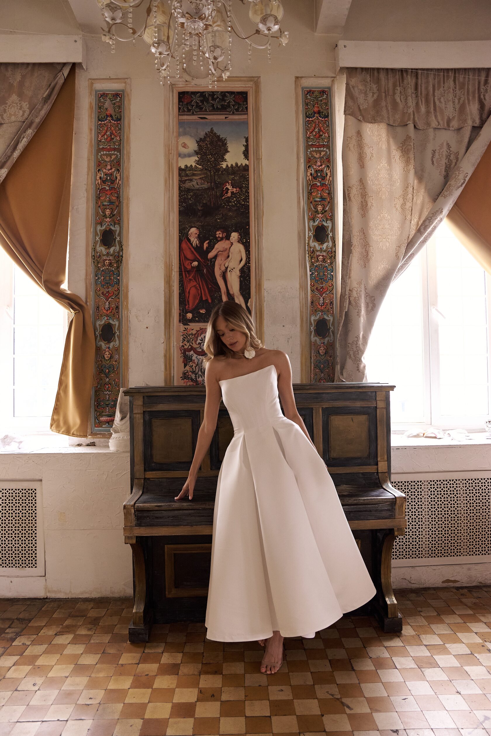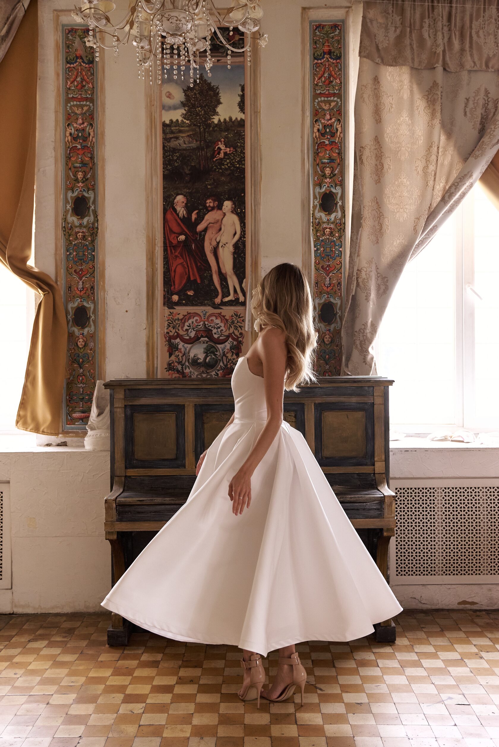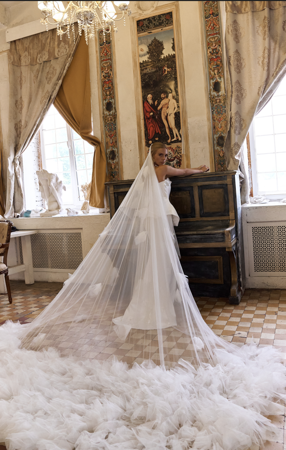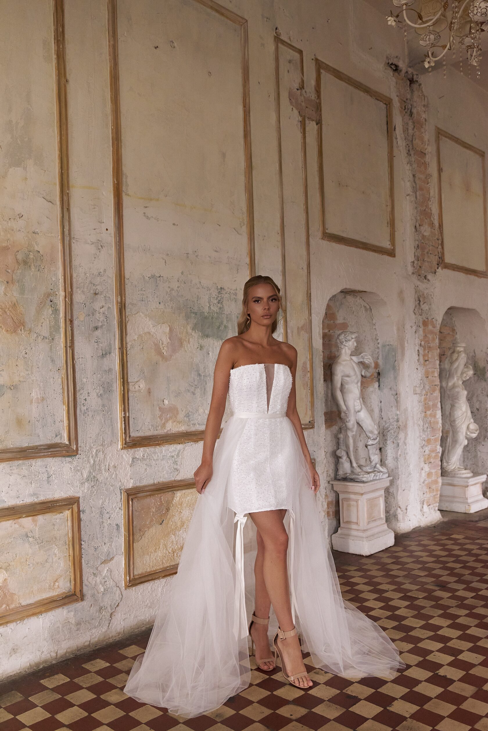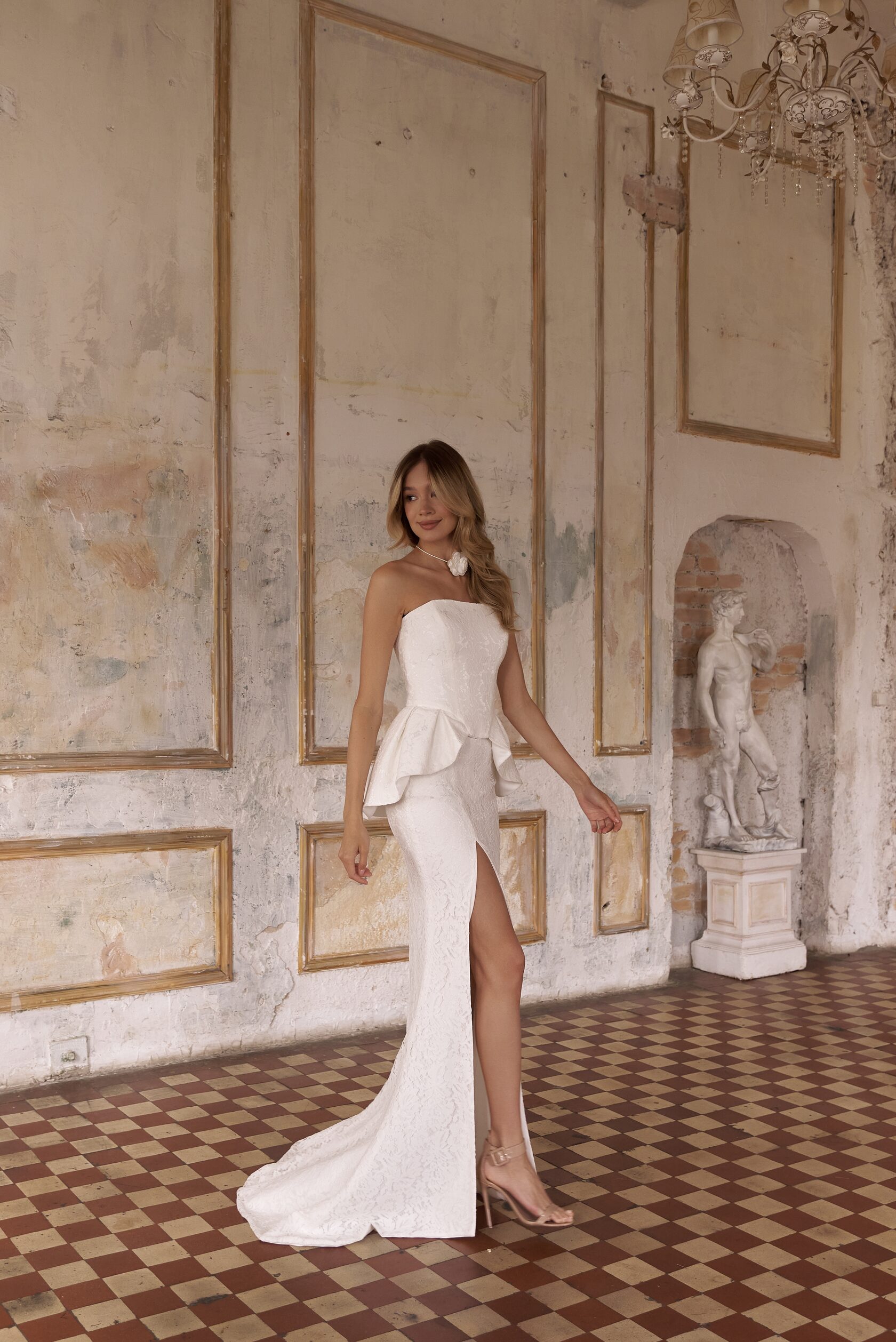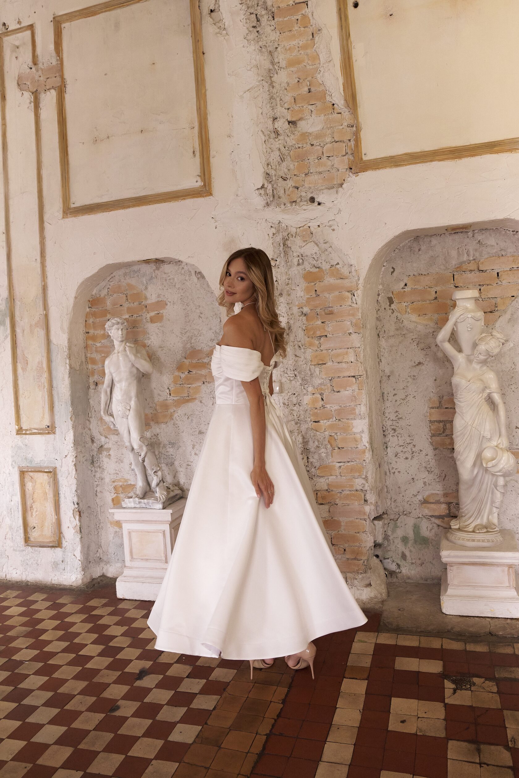 Эффектное пышное свадебное платье, разработанное с учетом главного тренда этого сезона – выразительного треугольного корсета, декорированного жемчугом. Этот роскошный наряд создан для невест, стремящихся создать запоминающийся, сказочный образ, сочетающий в себе классическую элегантность и современные тенденции.