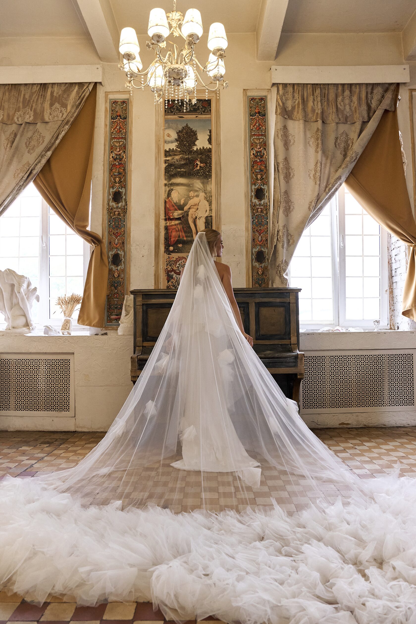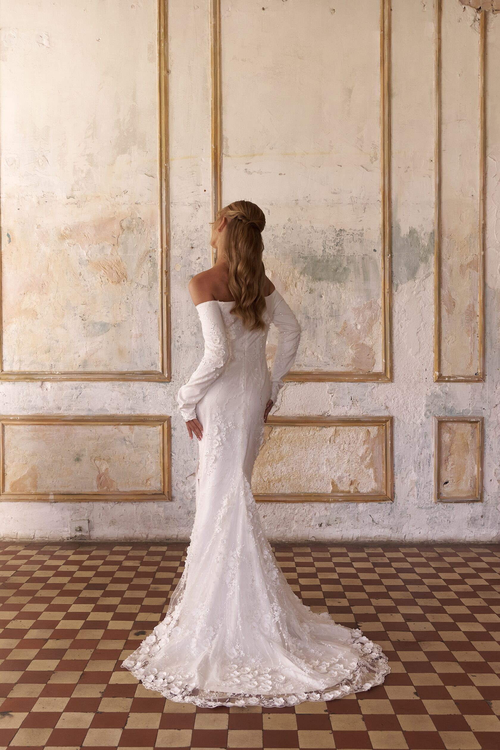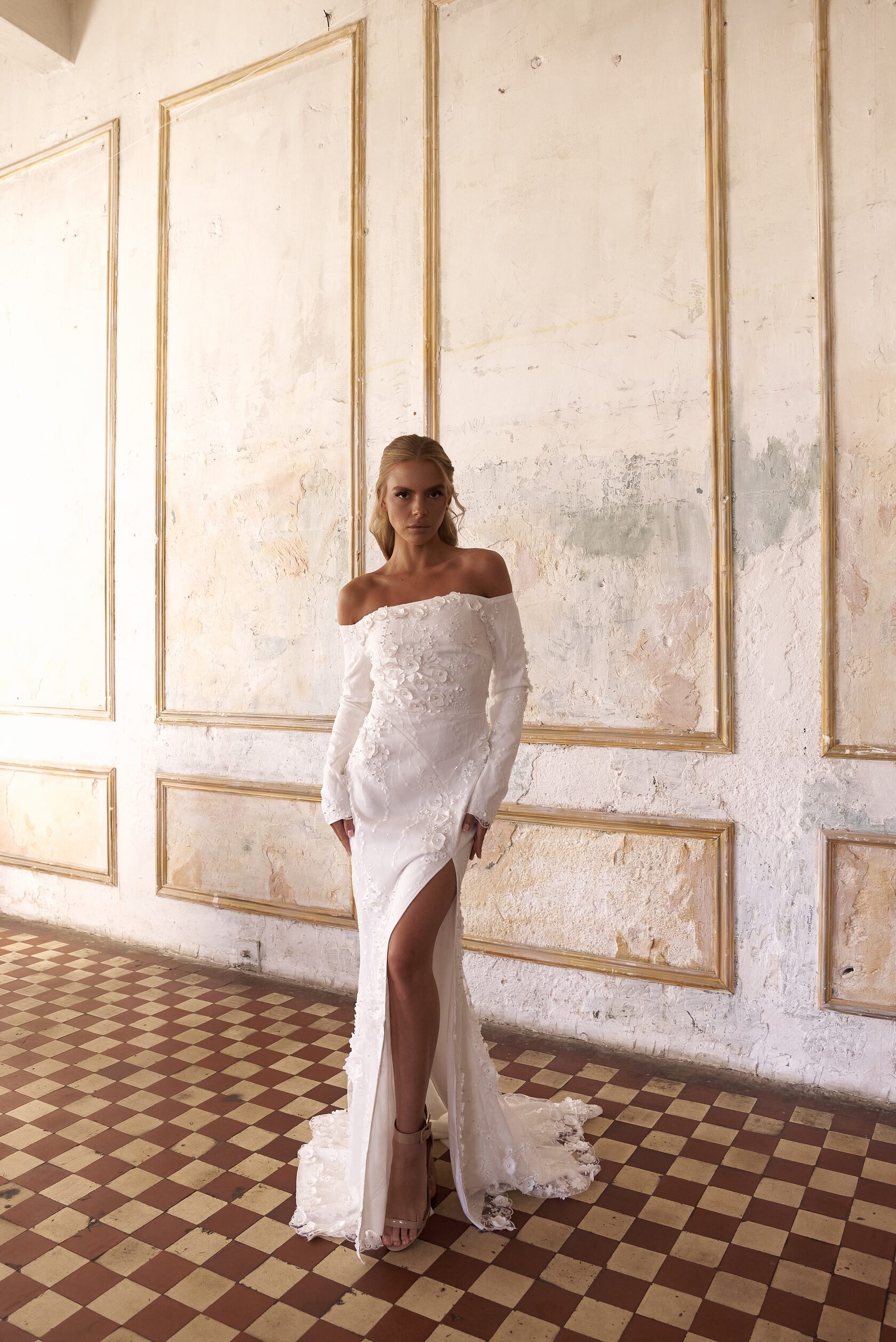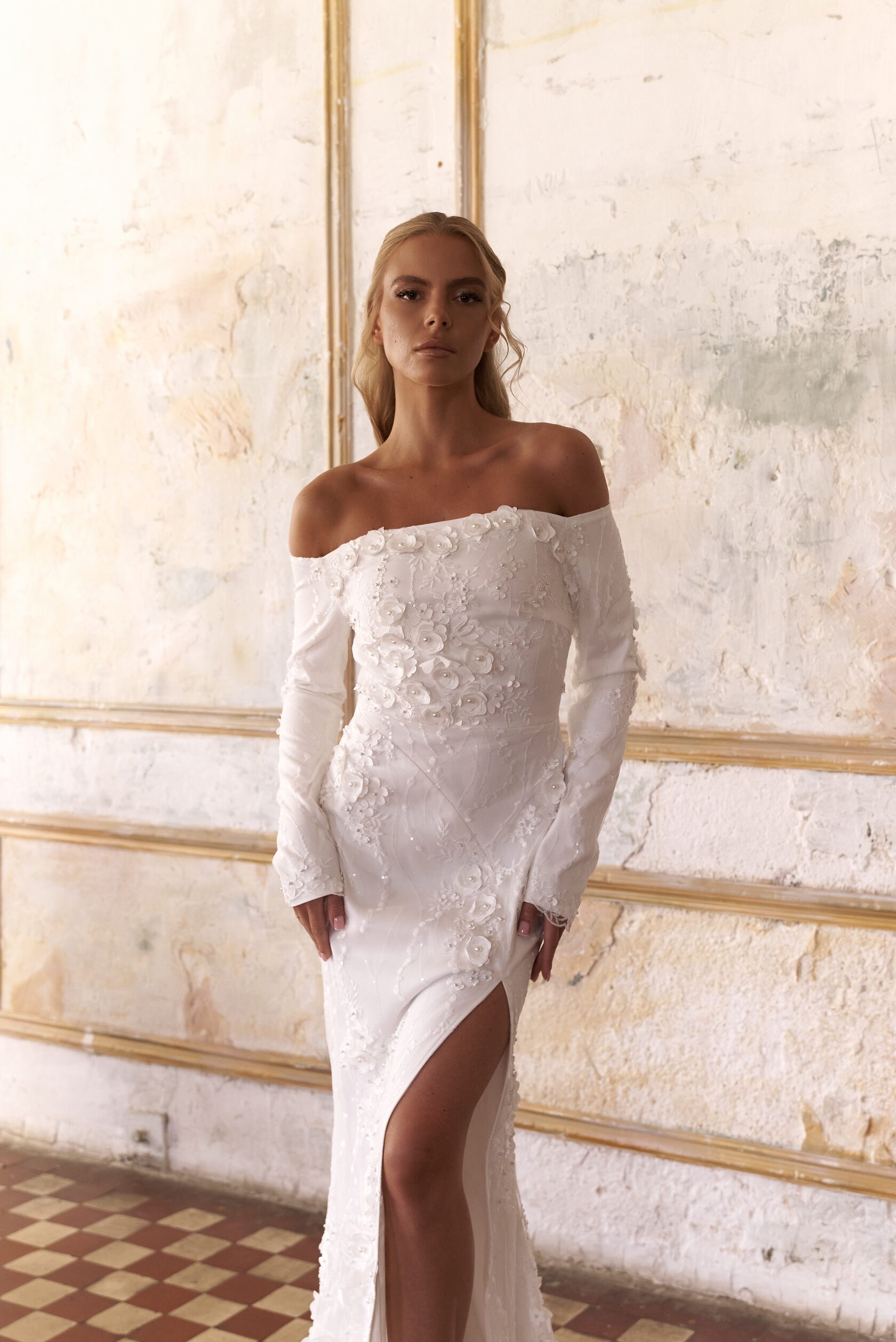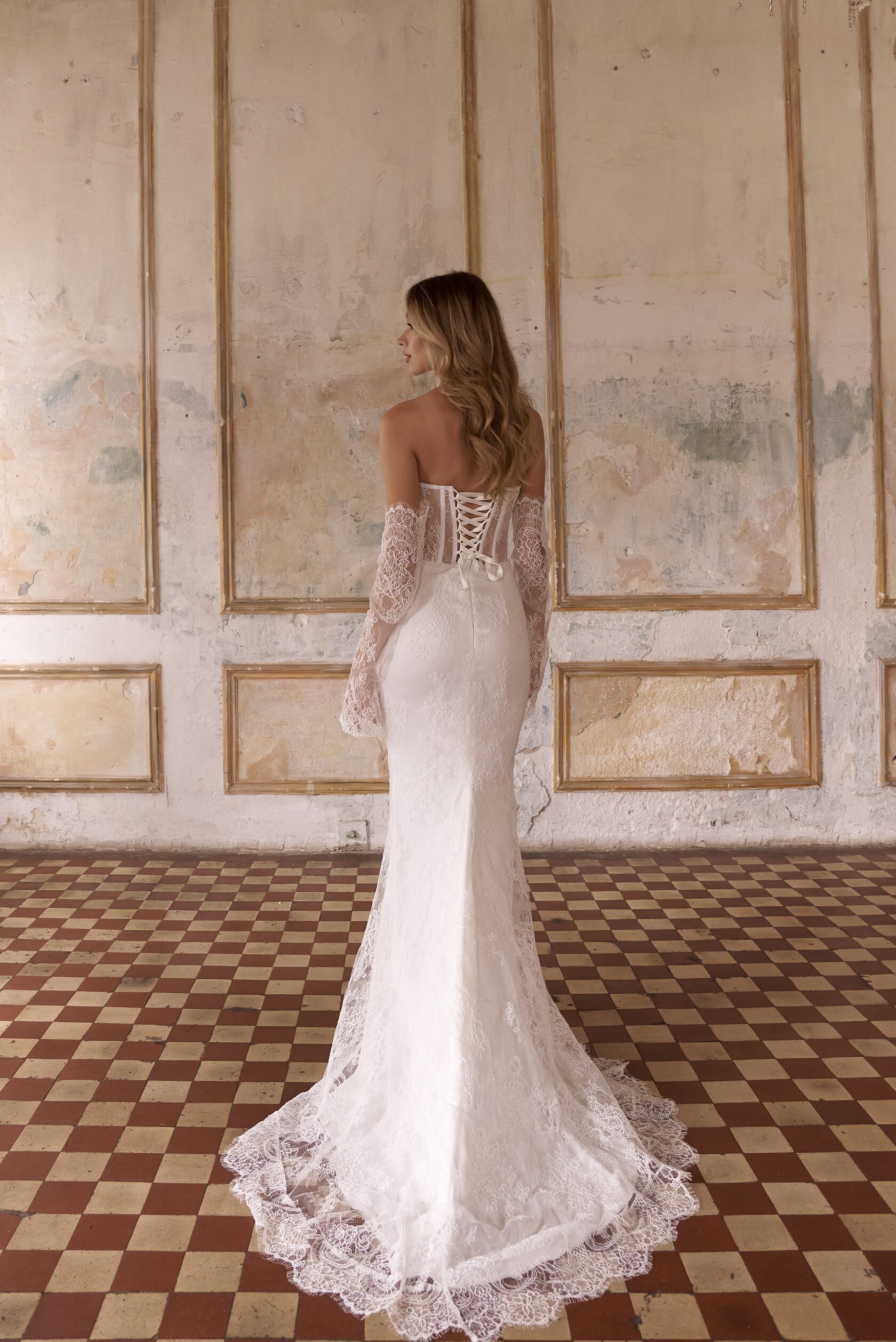 Эффектное пышное свадебное платье, разработанное с учетом главного тренда этого сезона – выразительного треугольного корсета, декорированного жемчугом. Этот роскошный наряд создан для невест, стремящихся создать запоминающийся, сказочный образ, сочетающий в себе классическую элегантность и современные тенденции.